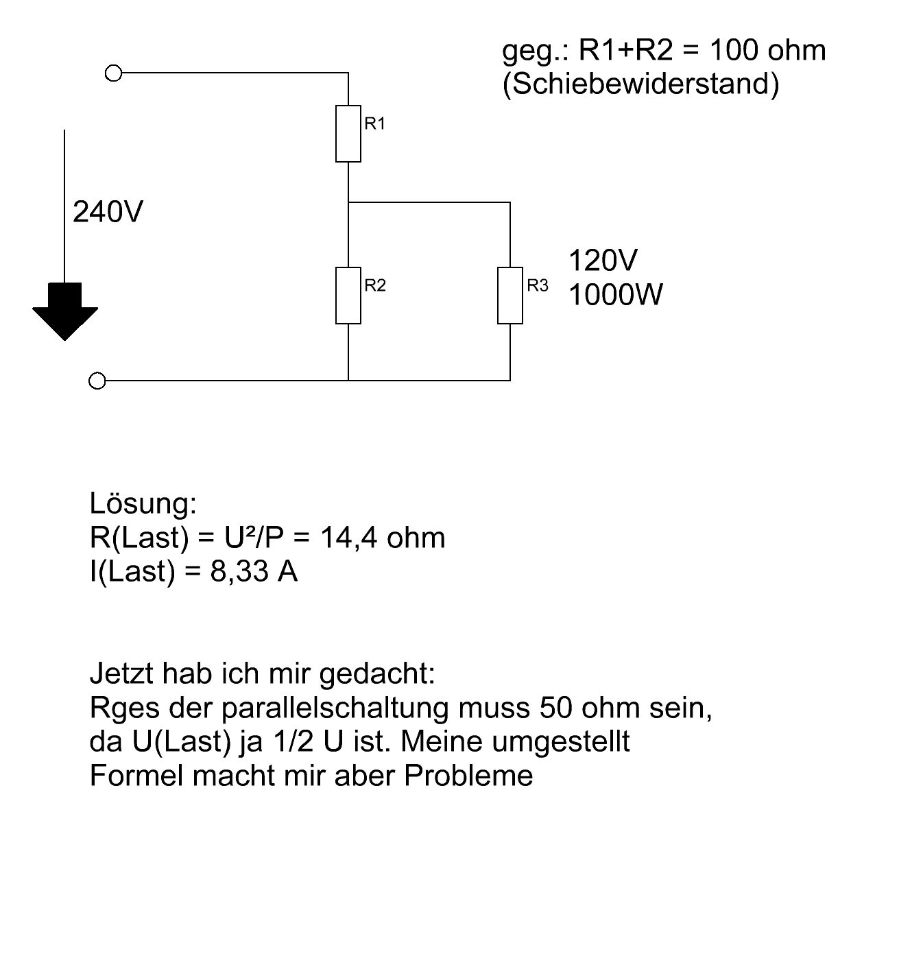 Vielleicht verstehe ich das Problem nicht ganz: Gesucht sind R3 und der Strom durch R3. Was unten steht ist der Ansatz, von dem aus der Fragesteller nicht weiter gekommen ist. Natürlich kann man auch so rechnen. Dann wird es komplizierter. Wie ich das sehe, ist das aber gar nicht gefragt. Ich verstehe die Frage so: Woher kommt R = U^2 / P aus der Musterlösung?