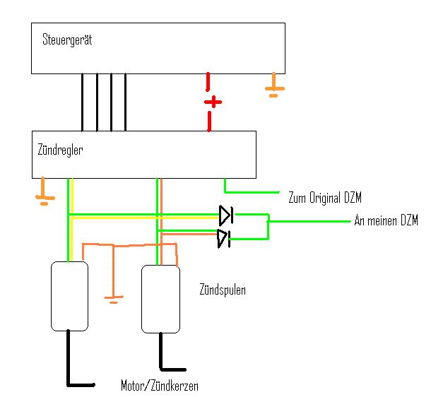 Ist eigentlich nix grossartiges, und der Einfachheit halber habe ich die restlichen 56 Kabel des Steuergerätes mal weggelassen ^^ Das Steuergerät bekommt von versch Sensoren (oberer Totpunkt, Lufttemperatur, öldruck, wassertemperatur usw) die signale, berechnet den zündpunkt und gibt das Signal an den Zündregler weiter, der heisst EEF IV oder ähnlich, weiss grad nicht auswendig. Auf der SW Zeichnung sieht man das Ding ,Pinbelegung: 1 PIP-Signal - ICM an PCM 2 Drehzahlmesser 3 SAW-Signal - PCM an ICM 4 Nicht belegt 5 CKP (-) 6 CKP (+) 7 Abschirmung 8 Batterie (15) 9 Modul an Masse 10 EI-Zündspule (Zylinder 1-4) 11 Nicht belegt 12 EI-Zündspule (Zylinder 2-3) Pin 2 geht original zum DZM, ich würde pin 10 und 12 mit den dioden gegenseitig sperren und zum DZM legen, da ich nicht weiss, ob 2 mit 10 oder 12 identisch ist. Ich hab gerade kein Schaltbild des DZM zur Hand, überlege gerade ob es sinnvoll wäre noch 2 hochohmige Widerstände in Reihe zu schalten, nicht dass das signal an pin 2 deutlich niedrigeren strom liefert und mir das signal von 10 und 12 über den DZM auf Masse gehen und die Zündspule guggt in die Röhre ^^ Wobei es laut Internetgerüchten mit den 2 Dioden funktionieren soll