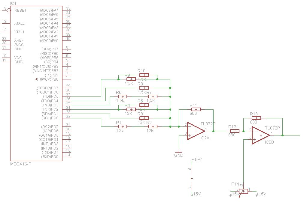 Hallo zusammen, habe folgendes Problem, ich nutze einen OPV (TL072NC) als Summierverstärker um eine DA-Wandlung durchzuführen. Vom µC ATMega 16 bekomme ich 6-Bit welche ich über Wiederstände von 24k bis 0,75kOhm auf den Invertierenden Eingang des OPVs lege und mit 680Ohm auf den Ausgang des OPVs rückkopple. Wenn ich den µC aussockle und die 5V jeweils an die entsprechenden Pins brücke funktioniert der DA-Wandler ohne Probleme wenn ich den ATMega aufstecke messe ich Spannungen von 0,1 bis 0,7 V an den mit "1" angesteuerten Ausgängen anstatt 5V. woran könnte das liegen?