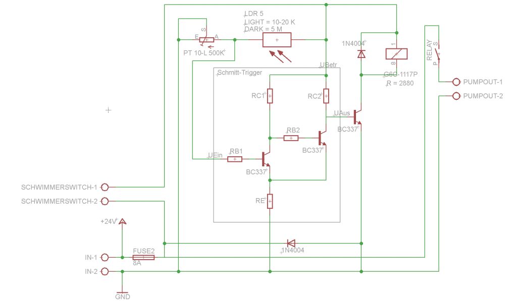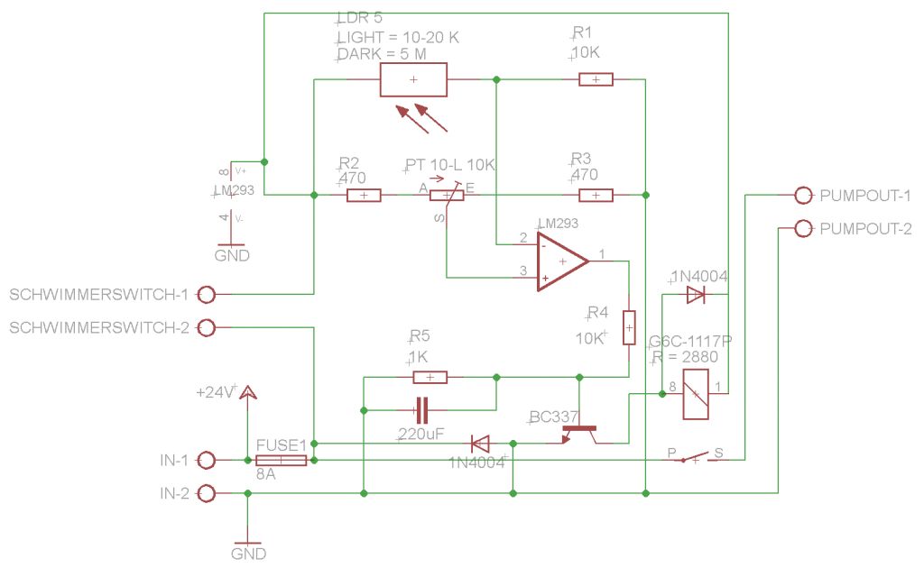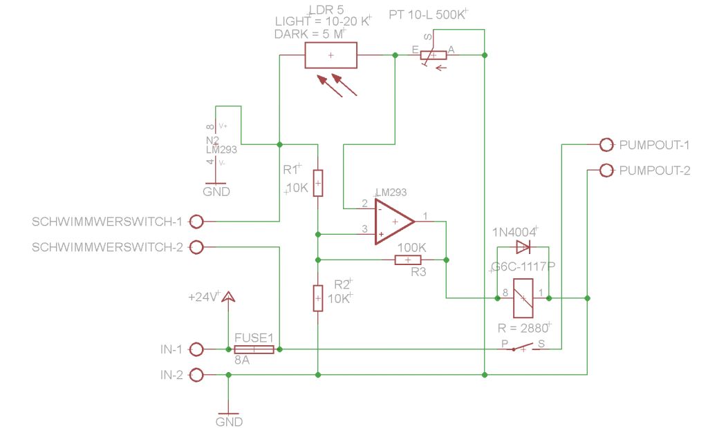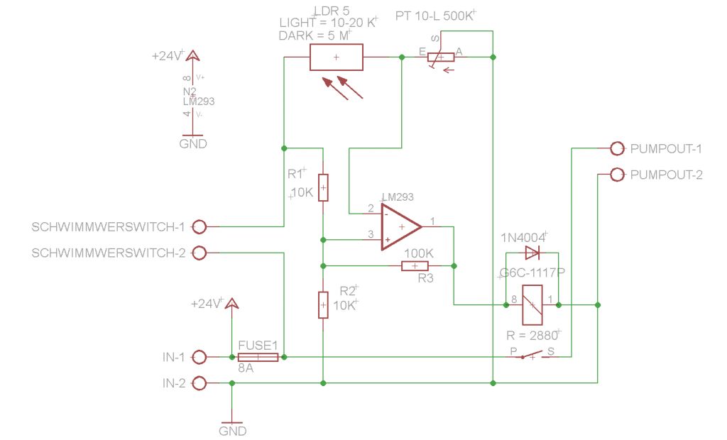 Ich hab jetzt eine andere Schaltung auf 12V Basis im Netz gefunden und diese versucht anzupassen. Die Schaltung hab ich von http://bastelmolch.ba.funpic.de/licht.HTM (Dämmerungsschalter mit LM741 ) Zumindest schaltet hier ein Transistor das Relais und nicht direkt der Komparator und der Kondensator soll auch noch ein Flattern des Relais verhindern. Die Ursprungsschaltung ist auf 12 V ausgelegt, ich sehe jetzt aber keinen Grund warum sie nicht auch für 24 V funktionieren sollte, oder? Ich hab auch wieder eine Freilaufdiode zum Schutz des Relais reingemacht, ist doch sinnvoll, oder? Genauso hab ich wieder die Diode reingemacht, die den Transistor schützen soll, wenn die Pumpe gerade laufen sollte und dann die Stromversorgung getrennt wird, und so eine umgekehrte Spannung induziert. Macht das so Sinn? Kann ich den Komparator LM293 lassen oder sollte da der Operationsverstärker LM741 rein? Gibt es bei den Werten für die Widerstände und dem Kondensator wegen der erhöhten Spannung etwas anzupassen ?