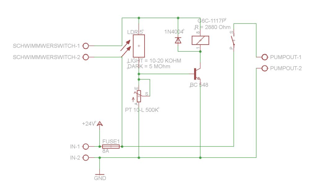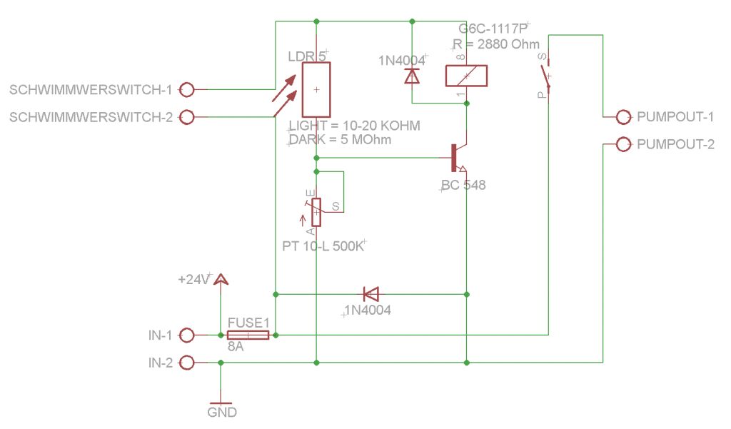 Also wenn da mal die Elektronik abrauchen sollte und du in Indonesien bist, ist es da nicht vielleicht doch eine Überlegung wert so wenig Elektronik einzubauen wie möglich? Ich finde die Idee mit dem sich selbst haltenden Relais da recht gut. Die Punpe kann dann nur bei Tageslicht einschalten, es gibt kein Kammerflimmern beim Relais und der einzige Nachteil wäre, dass die Pumpe nicht bei Einbruch der Dunkelheit abschaltet sondern noch weiterpumpt bis der Schwimmerschalter den Stromkreis trennt. (Das setzt natürlich voraus, dass der Schwimmerschalter den Stromkreis komplett unterbricht, nicht nur den zum Helligkeitsschalter, wofür er genug Schaltleistung haben muss)
