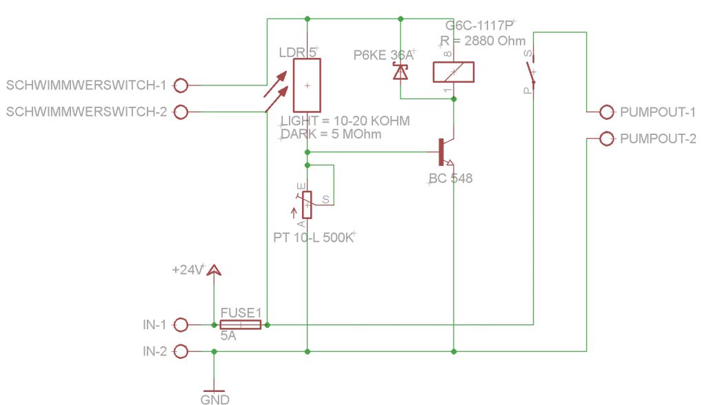 Hallo zusammen, also sobald Tageslicht vorhanden ist und mein Wasserturm leer ist, soll meine 24V Tieftauchpumpe anspringen. Also das Steuergerät wird mit 24V Batteriespannung gespeisst. An dem Steuergerät hängt ebenfalls ein Schwimmerschalter der zum Wasserturm geht. Also ich hab versucht den Plan selbst zu machen und hab ihn so ähnlich aufgebaut wie ein Dämmerungsschalter nur LDR und den Poti vertauscht. Die Tieftauchpumpe, die an dem Steuergerät hängen soll ist eine Shurflo 9300 und wieht angeblich maximal 4A. Das 24V Relais geht bis 10A. Ich hab den Schaltplan angehängt. Wäre das so richtig? Wie sieht es denn mit der Freilaufdiode und dem Poti aus? Würde das so passen? Danke für die Unterstützung. Grüße Markus