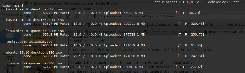 Seit etwa 3 Monaten hab ich meine DockStar 24/7 am Netz, darauf läuft unter anderem rtorrent mit Bandbreitensteuerung. Aus meinem Upload schließe ich, dass legale Downloads durchaus eine große Rolle im torrent-Netzwerk spielen.