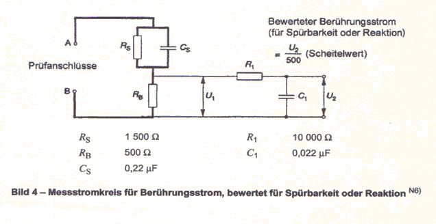 Ich spekuliere mal: R_S Hautwiderstand (Skin) R_B Körperwiderstand (Body) R_1 + C_1 Tiefpass, denn hohe Frequenzen werden nicht wahrgenommen (vgl. Teslaspule) Darüberhinaus muss man zwischen Isolationswiderstand (= Berührstrom?) und Ableitstrom unterscheiden. Ableitstrom bezeichnet während dem Betrieb über den Schutzleiter auftretende Ströme und von berührbaren leitfähigen Teilen gegen Erde. Der Isolationswiderstand betrifft alle berührbaren Teile die leitfähig sind und bei Schutzklasse I Geräten auch den Widerstand zwischen Netz und Schutzleiter. Isolationswiderstand wird mit Gleichspannung ermittelt und abgeschaltet ermittelt, Ableitströme werden bei Normalbetrieb mit Wechselspannung gemessen. Darüberhinaus solltest du dich in den aktuellen Normen über die erforderlichen Messungen informieren. Du bist für die ordnungsgemäße Durchführung verantwortlich und haftbar. Messgerätehersteller bieten fertige speziell für solche Messungen konzipierte Geräte und geben Sicherheit, das du deinen Pflichten nachgekommen bist.