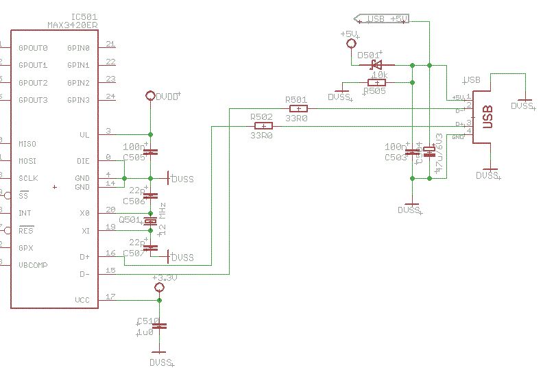 Hi Leute, ich habe folgendes Problem: In meinem Projekt benutzte ich eine MAX3420 als USB-SPI-Schnittstelle. Die Beschaltung ist erfolgt wie im Datenblatt vorgeschlagen. Alle Spannungen sind vorhanden, mein Quarz schwingt mit 12 MHz. (Schaltplan als Anhang/ DVDD=2,5V / DVSS=GND) Wenn ich jedoch das System an meinen Rechner anstecke, passiert nichts. Es erscheint keine Meldung das ein HID-System gefunden worden ist und im Gerätemanager taucht auch nichts auf. Wo liegt der Fehler? Hat jemand eine Erklärung und/oder Hilfestellung? Gruß Alex
