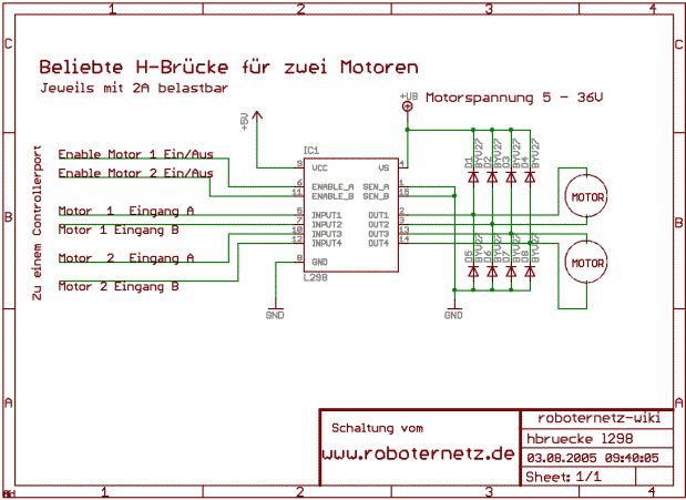 > Entschuldige mich wegen den Rechtschreibfehlern Das ist nicht das Problem sondern das > 4007 kann ich also auch benutzen denn das heisst daß du nichts verstanden hast. Denn > alles wird mit einem schlicht normalen AKKu betriben > und da würde doch eigentlich die 1N4007 ausreichen die Art der Stromversorgung hat nichts mit der notwendigen Diode zu tun. Es geht um ihre Schaltgeschwindigkeit Ein Motor PRODUZIERT auch eine Spannung, nämlich beim Abschalten. Wenn du also deinen Motor über den L298 abschaltest, fliesst der produzierte Strom über die Dioden in die Versorgungsspannung bzs. in Masse hinein. Das ist in Ordnung, dazu sind Dioden da, so arbeitet der Motor als Generator und produziert Spannung. Würde man die Spannung nicht mit Dioden ableiten, würde die Spannung am L298 anliegen und ihn zerstören. Nun kann es aber sein, daß der L298 wieder eingeschaltet wird, der Motor, der gerade abbremst und die Dioden benutzt also wieder angetrieben werden soll. Dabei müssen die Dioden wieder sperren, weil plötzlich an ihnen eine Spannung wieder in Sperrichtung anliegt. Die Frage ist, wie schnell sperren sie dann, denn so lange sie nicht sperren liegt ein satter Kurzschluss zwischen + und Masse der Versorgungsspannung vor. Und deine 1N4007 ist einfach viel zu langsam. Die sperrt nicht gleich, sondern später. Und so lange fliesst der Kurzschlusstrom durch den L298 und das mag der nicht davon geht er eventuell kaputt. Daher steht im Schaltplan eine fast recovery Diode, die in Deutschland handelsübliche fast recovery Diode, eine BYV27. Du kannst auch eine andere nehmen, so lange es eine fast recovery Diode ist die den Strom verträgt. Du kannst auch eine Schottky-Diode nehmen wie SB240. Wir wissen nicht, was dein Dealer da hat. Es gibt hunderte. Übrigens: Zwischen Motorspannung +uB und Masse MUSS ein Elko drangebaut werden, der die Energie aufnehmen kann die der Motor beim Abbremsen als Generator erzeugt ohne daß die Spannung +Ub zu weit ansteigt. Fehlt der Elko, kann die Scaltung zerstört werden. Ich bin sicher, daß die Shcaltung zum dranbauen an eine andere Schaltung gedacht war, in der der Elko vorgesehen war. Vergiss ihn also nicht.