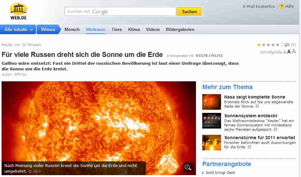 Also ich weiß nicht, wer sich jetzt am besten auskennt in Astronomie: Web.de, die Russen oder die NASA? Wir haben die Sonnenrückseite noch nie gesehen? (siehe rechts im Bild) Erklärt doch mal... Ich leide schon so lange daran, daß ich die Mondrückseite und meine eigene Rückseite nicht direkt anschauen kann, aber das ist jetzt zuviel! :-) Quelle: Web.de http://web.de/magazine/wissen/weltraum/12131506-fuer-viele-russen-dreht-sich-die-sonne-um-die-erde.html#.A1000109