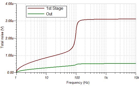 > Aber warum machst du die Schaltung nicht höherohmig? Dann kannst du auch > deine 220nF PPS-Caps einsetzen. Die sind wirklich noch einen Tick > besser! In erster Linie deshalb, weil ich an die schneller bekomme. Ich überlege aber die PPS in einer späteren Version einzusetzen. Im Bild ist das Ergebnis der Noise-Simulation von TINA zu sehen. Ich weiß nicht ob du damit schon einmal gearbeitet hast, ich vermute (vielleicht weiß da jemand mehr?) mit dem Total-Noise wird das Integral über das ganze Rauschen sein bis zu der Frequenz die unten aufgetragen ist. Wenn das stimmt, dann wäre das thermische Rauschen schon etwas zu groß für meinen Geschmack. Dabei habe ich den Filter schon etwas umgebaut, so das die Spannung erst direkt vor dem Tiefpass geteilt wird, deshalb auch diese starke Verbesserung nach der 1st Stage. Ich werd mir aber wohl nochmal eine Lösung mit mehr Stufen durch den Kopf gehen lassen.
