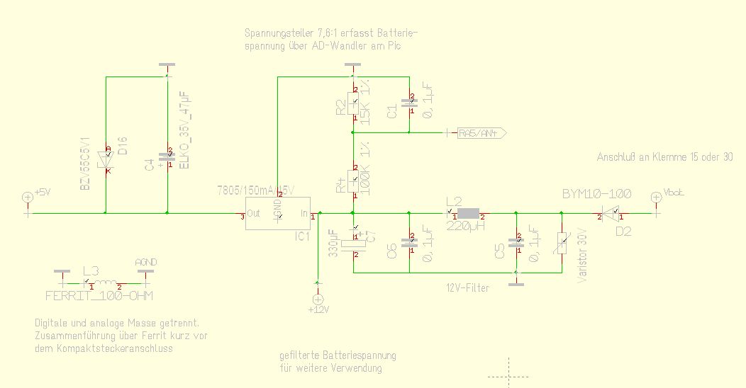 Seltsam erscheint mir die 5.1V Zenerdiode am 5V-Ausgang! Laut Datenblatt des 7805 (je nach Hersteller) kann die geregelte Ausgangsspannung schon mal 5.25V betragen. Und was macht die Z-Diode dann? Gruss Michael