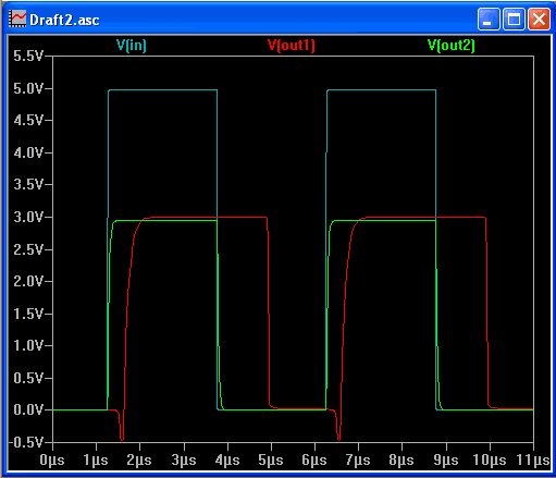 @see4far: Da bin ich mir sehr sicher, dass das die Ursache sein könnte. Ich habe mal Ulrichs Schaltung bei 200 kHz simuliert, weil es mich jetzt selbst interessiert hat, wie langsam die Transistoren konkret schalten. Im Anhang ist das erschütternde Ergebnis. - Die türkise Kurve "in" ist das 5-Volt-Eingangsignal. - Die rote Kurve "out1" ist der Ausgang von Ulrichs Pegelwandler an 100 pF Last. - Die grüne Kurve "out2" ist ein simpler Spannungsteiler aus 470 Ohm und 680 Ohm. Die Last beträgt auch 100 pF. Ich denke, die Kurven sprechen für sich... Das was aus Ulrichs Schaltung kommt, hat nichts mehr mit dem Eingangssignal zu tun. Der simple Spannungsteiler ist selbst an der unrealistisch großen 100 pF Last noch nahezu perfekt. Und das ganze bei nur 200 kHz!