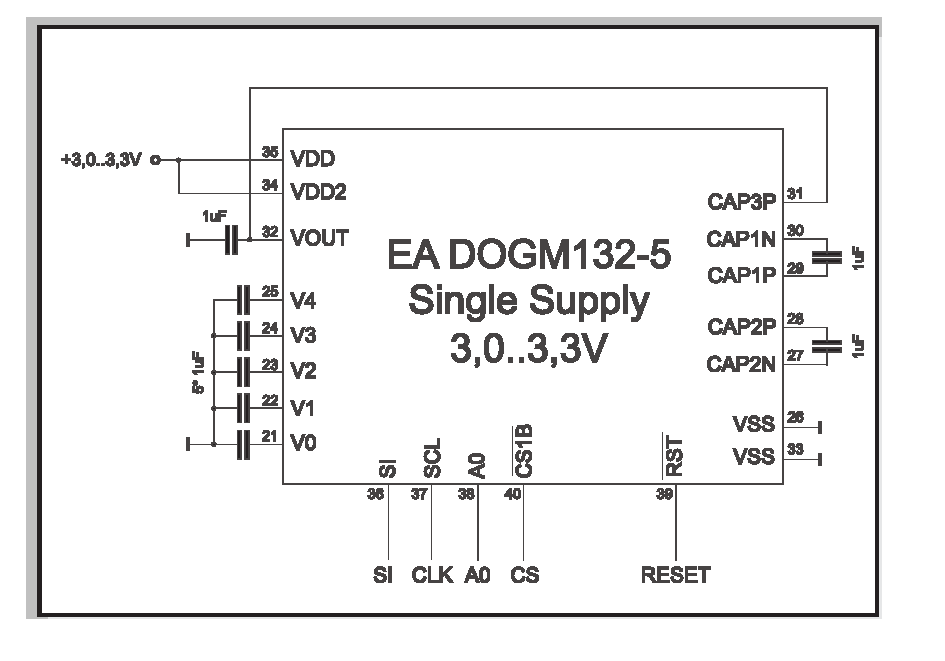 Guten Morgen Gemeinde, ich habe ein Display 'Display Dogm 132 - 5' und möchte es wie auf der angehängten Grafik beschalten. Der Controller ist dann ein ATMega 8. Weis jemand von Euch wie weit die Kondensatoren vom Display entfernt sein dürfen, damit das Ganze noch funktioniert ? Mein Plan ist es die Kondensatoren auf einer seperaten Platine unterhalb der Display - Platine zu positionieren (Sandwichbauweise). Der Link zum kompletten Datenblatt http://www.lcd-module.de/pdf/grafik/dogm132-5.pdf Danke schon mal für Eure Hilfe Jörg