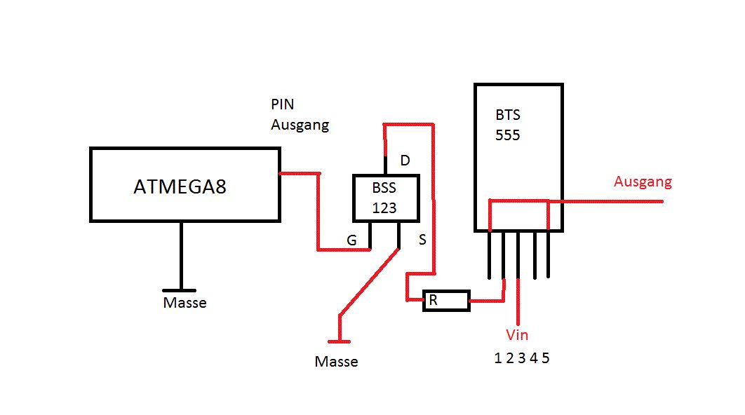 Guten Tag, Ich brauche für mein nächstes Projekt einen BTS555 an einem M8. Dazwischen brauche ich ja einen Fet. Da habe ich mir den BSS123 ausgesucht.Ich muss eine Open-Collektor Schaltung einbauen. Hier die Schaltpläne: http://i2c2p.twibright.com/datasheet/BSS123.pdf http://www.spaennare.se/PWM/bts555.pdf Anbei habe ich euch einen "Schaltplan" angehängt. Könntet ihr mal drüberschauen on das so passt? Brauche ich noch einen Widerstand zwischen M8 und dem Fet? Danke für eure Antworten, Daniel