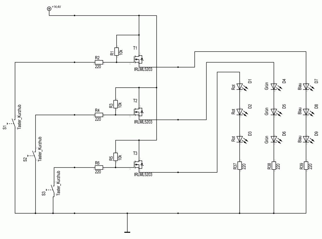 Hallo zusammen, ein Modellbaufreund hat für eins seiner Modelle eine LED-Beleuchtung geplant und dafür so RGB-Leisten besorgt (gemeinsames Minus). Die vorhandene Steuerelektronik hat jedoch gemeinsames Plus. Jetzt dachte ich mir, dass man das einfach "umswitchen" kann, indem ich so eine Schaltung wie im Anhang davor schalte, aber als ich das eben ausprobieren wollte, staunte ich nicht schlecht, dass es absolut nicht funktionierte. Ich muss leider zugeben, dass das meine erste MOSFET-Schaltung ist und ich dachte, die Informationen, die ich aus dem Internet gefunden habe, sollten reichen, damit das funktioniert, aber leider.... Also es ist so, dass alle LEDs dauerhaft leuchten, ganz gleich, ob ich die Leitungen bei den Schaltern mit Minus verbinde (also wie im Schaltplan), oder öffne (und die 10kOhm die Gates auf + ziehen) oder direkt auf Plus gehe... Die Teile leiten immer :-( Kann mir bitte einer helfen und sagen, was ich verkehrt gemacht habe? Soweit ich das verstanden habe, sollten bei P-Kanal MOSFETs die Gate-Spannung weit unterhalb der Drain-/Source-Spannung liegen, damit die Teile leiten und gleich groß, damit sie sperren... Das scheint aber falsch zu sein :-( Ich würde mich freuen, wenn mich da bitte jemand aufklären könnte. Viele Grüße und noch einen schönen Abend, Michael