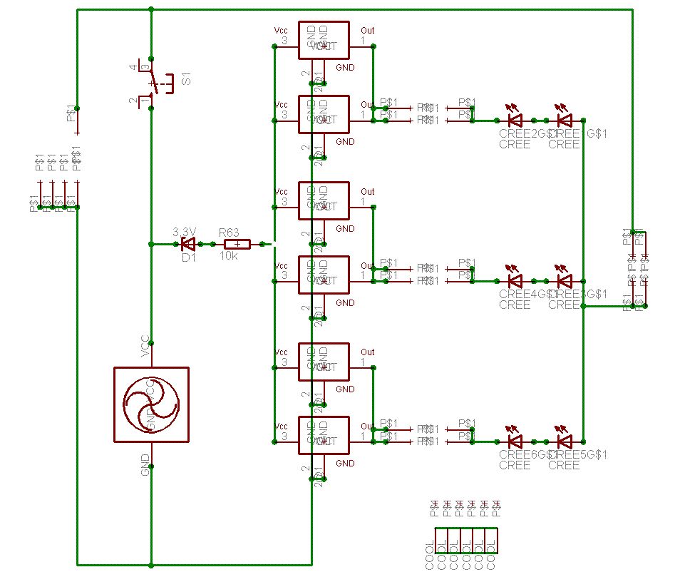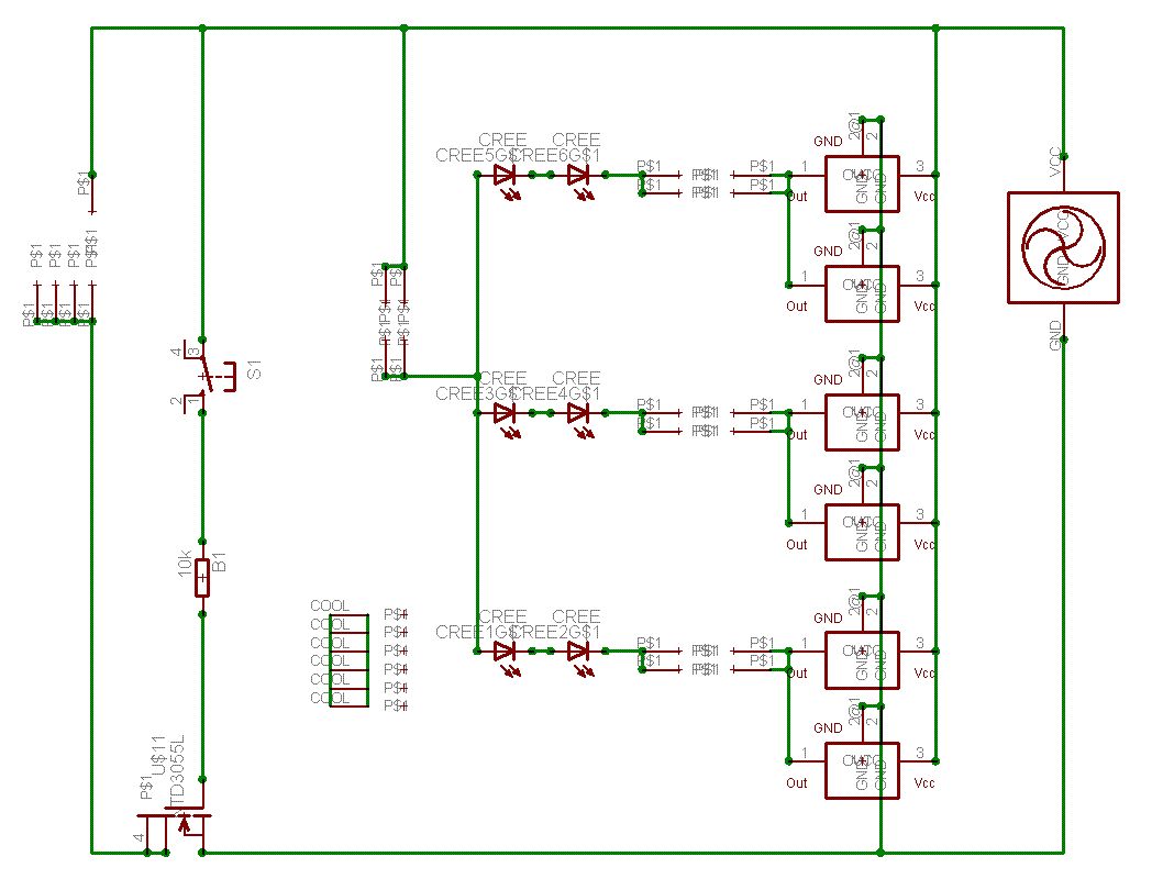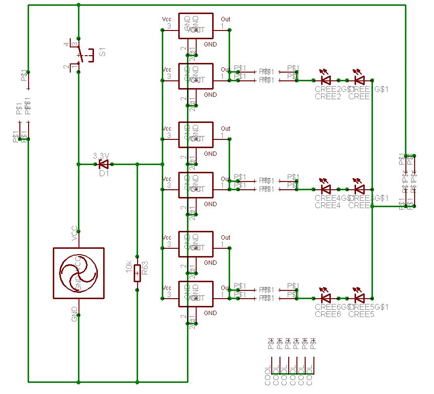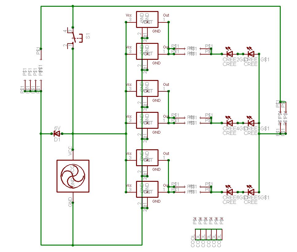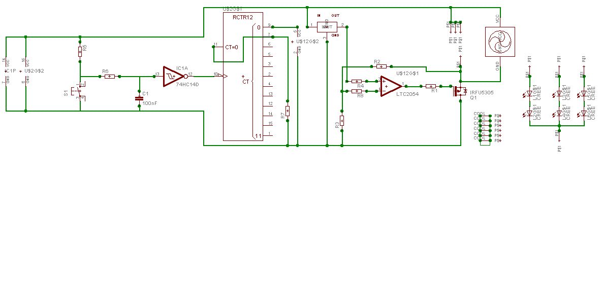 Sooo jetzt hier Der MAX6125 liefert konstante 2,5V an den noninv-OP-Eingang Der Spannungsteiler R2-R3 ist so dimensioniert, dass bei 6,8V an den LED 2,5V am Eingang anliegt Fällt die Spannung ab, macht der OP den FET weiter auf R4 und R8 begrenzen den Eingangsstrom des OP, damits den nicht zerschiesst Brauch ich dann noch Widerstände an den LED? Funktioniert das so oder was muss noch verändert werden? Kurze Anmerkung Ich hab die LED rechts hingesetzt und im Schaltplan durch Klemmen ersetzt, da mit das unter EAGLE das Layouten DEUTLICH vereinfacht, ihr müsst euch die 6 LED einfach parallel zum Lüfter vorstellen. Bezüglich des Schaltens Würde mich immer noch sehr freuen, wenn mir wer so einen kleinen 3x3-5x5 Taster mit Rastfunktion posten könnte, dann hau ich auch den Trigger und den Counter raus Danke im Voraus (aber nur für nette Kritik und Hilfe) Björn