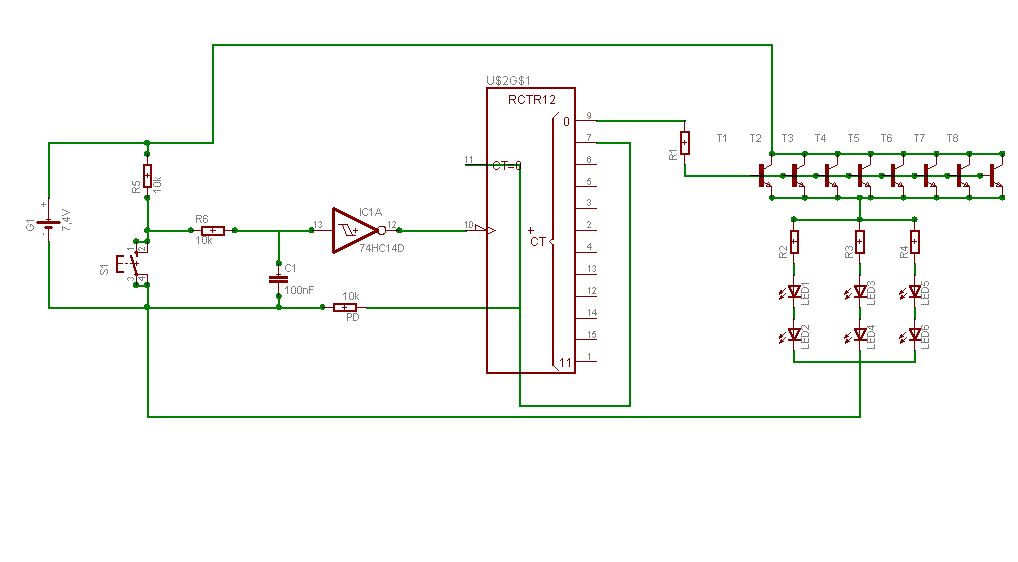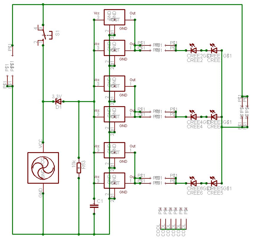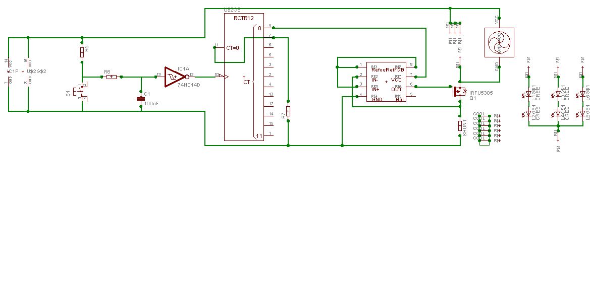 @Simon K. >Kann man die AMC Teile wirklich einfach parallelschalten? Gibt es dazu >eine AppNote oder sowas? Eigentlich lassen sich Konstantstromquellen immer parallelschalten. Allerdings will dieser AMC7135 höchstens 6V sehen - vielleicht nicht so gut für obige Anwendung. @Morgoth (Gast) >So in etwa? nöö - nicht wirklich: - Mosfet muß N-Kanal sein - Mosfet muß mit S nach unten - der LM10 braucht noch einen Abblock-C Und die beiden linken IC's kannste sicherlich durch einen halben 74HC74 ersetzen (Taster auf Clockeingang, /Q auf Dateneingang zurückgeführt)