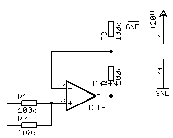 Ich glaube, ich verstehe, was Du meinst, aber so ganz klar ist mir noch nicht, wo (bis auf die Bemessung der Widerstände) der Unterschied liegt. Gehen wir mal von 0 .. +20 V Versorgungsspannung aus. Wenn ich jetzt am Eingang eine Spannung von 4 V habe, und einen Offset von 3 V, soll das Ergebnis (am finalen Ausgang) ja 4 + 3 = 7 V sein. Die Ausgangspannung am Addierer errechnet sich aus -R4 * (Uin / R3 + Uofs / R5). Bei Uin = 4 und Uofs = 3 ist das -10 * (4 / 10 + 3 / 10) = -(4 + 3) = -7. OK, verstehe. :-D Der Addierer braucht wohl eine 0, und die ist dann durch das Niveau des nichtinvertierenden Einganges bestimmt. Würde da nicht ein symmetrischer Spannungsteiler reichen, der Vcc/2 als 0 definiert? Relativ dazu müsste die Addition dann ja wieder stimmen. Die rechnerischen Eingangswerte wären dann Uin' = Uin - 10 und Uofs' = Uofs - 10, also 4 V => -6 V und 3 V => -7 V. Dann wäre die Ausgangsspanung des Addierers (ich kürze die identischen Rs mal raus) Vcc/2 + -(Uin' + Uofs') = 10 - (-6 + -7) = -3 Schon wieder Ooops! Alles klar, Bereichsüberschreitung. R4 muss halbiert werden oder R3 und R5 müssen verdoppelt werden. Damit werden die Werte vor der Addition durch 2 geteilt was 10 - (-3 + -3,5) = 3,5V ergibt. Diese müssten dann noch mit dem letzten OP (diesmal relativ zu 0 v) invertiert verdoppelt werden. Ich würde das gerne noch tiefergehend zu Ende führen, aber die Kleine will ihr Pomps (Griesbrei).. Melde mich des Nächtens nochmal.