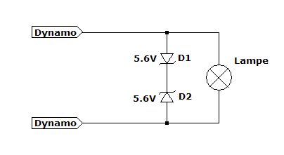 Eine leistungsfähige Z-Diode mit 6V im TO220 Gehäuse an ein Metallteil schrauben und parallel an den Dynamo klemmen. Wenn man keine passende Z-Diode hat nimmt man einen NPN-Transistor und packt die Z-Diode an die Basis, Kollektor und Z-Diode verbinden, fertig ist die Leistungs Z-Diode. MFG Falk P S Warum baut man sowas nicht gleich in den Dynamo? Brauchen die Lampenhersteller Umsatz?