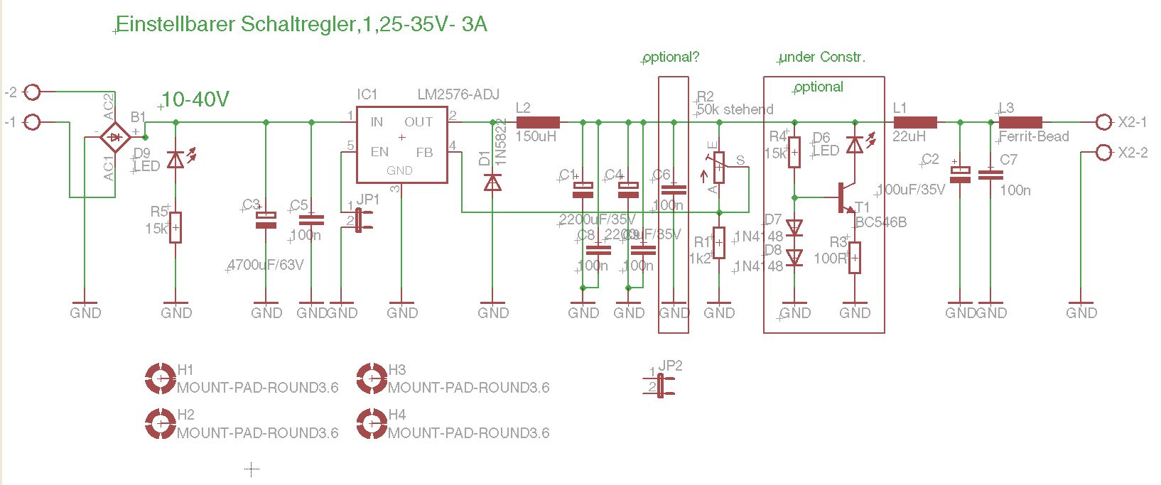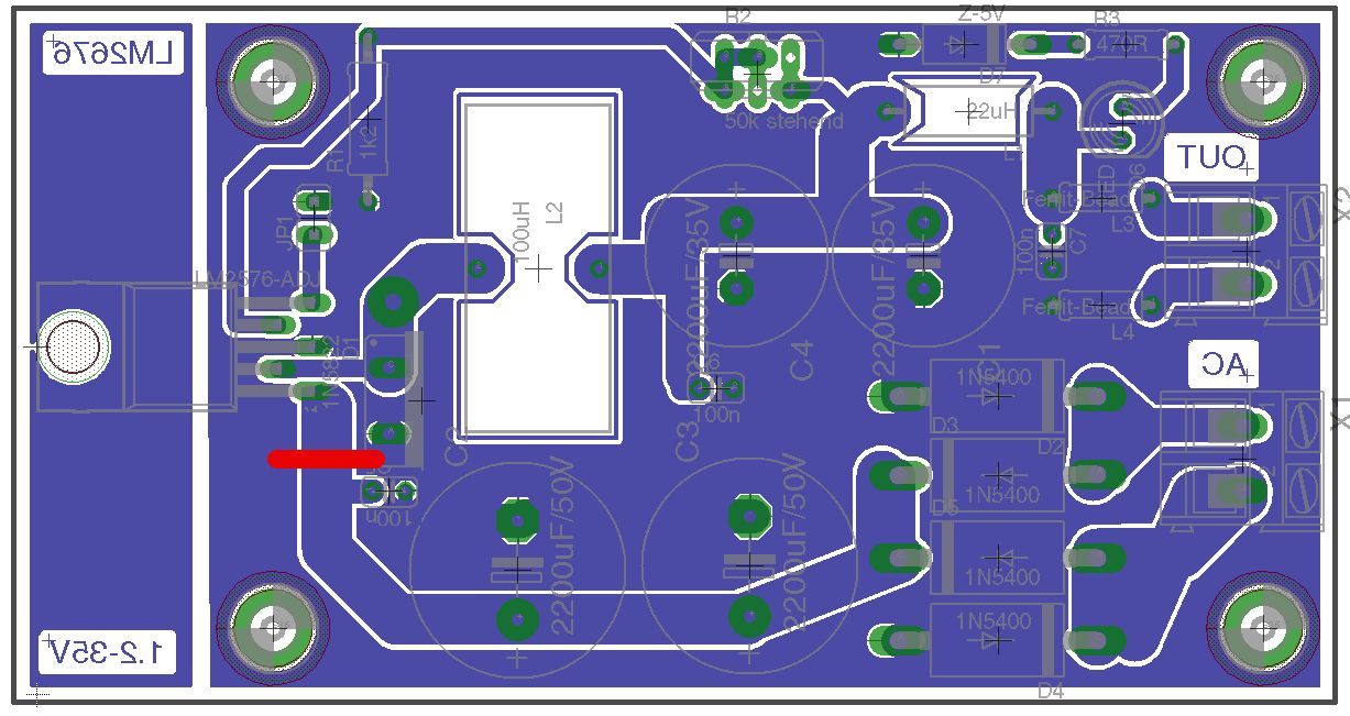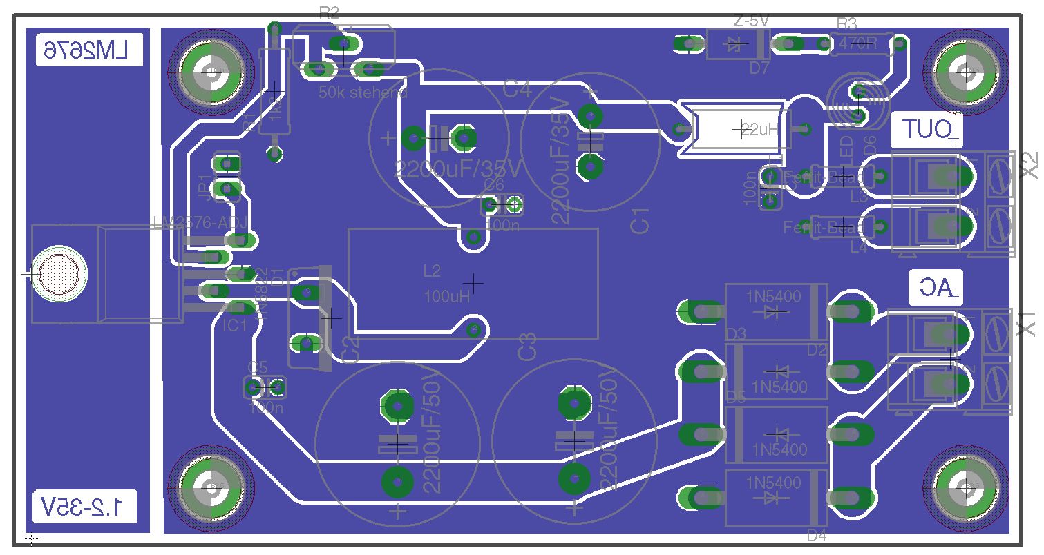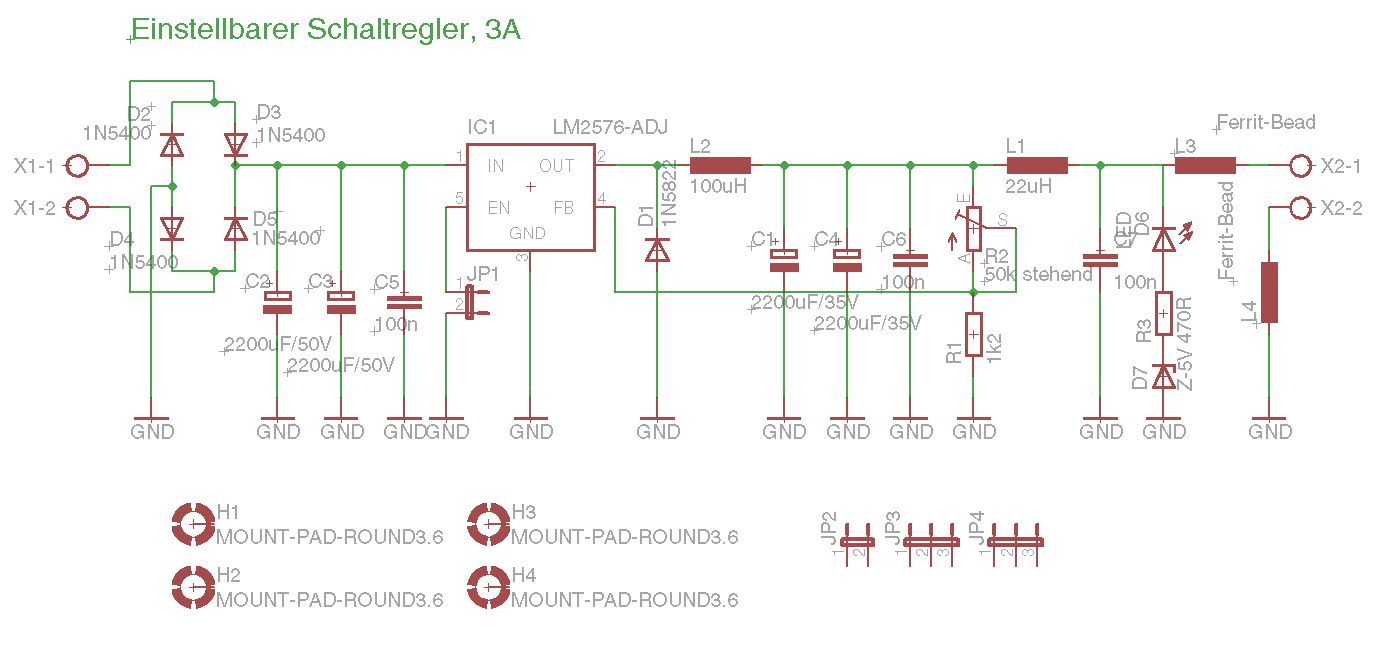 ich hätte hier mal eine LM2576-Adjust-Version. Als Schottky könnte man Wahlweise eine MBR360 o.Ä. verwenden, statt der 1N5822! Ich bin am überlegen, ob man evtl. nach den 22µH noch einen 100µF setzen sollte?!? Ich möchte das Teil universell einsetzen. Anbei mal der Schaltplan sowie das Layout. Jetzt könnt ihr mich mal auseinander nehmen :-) Gruß Michael