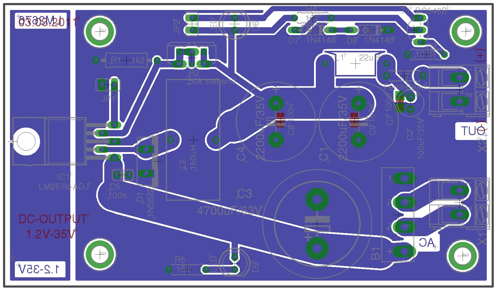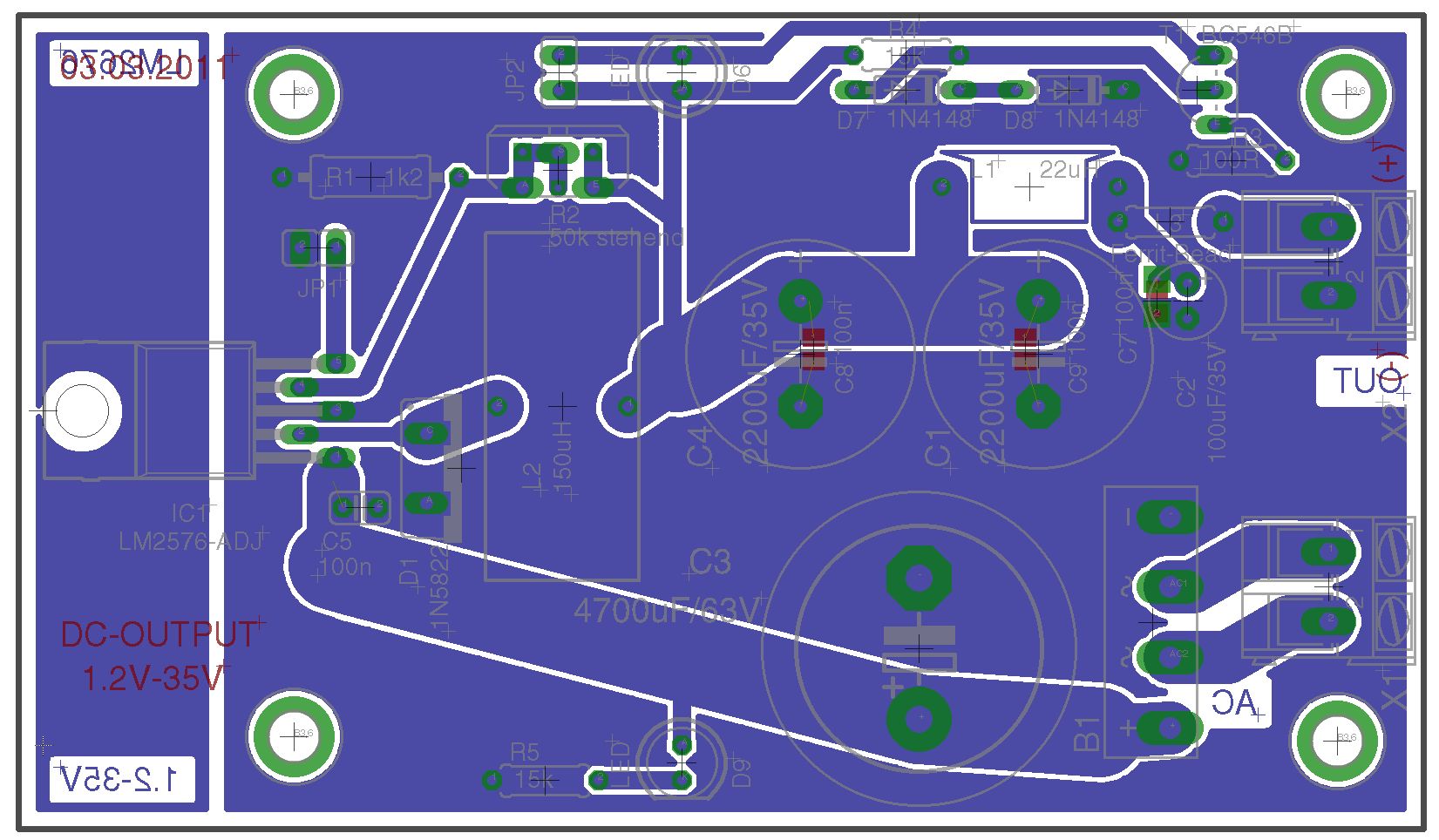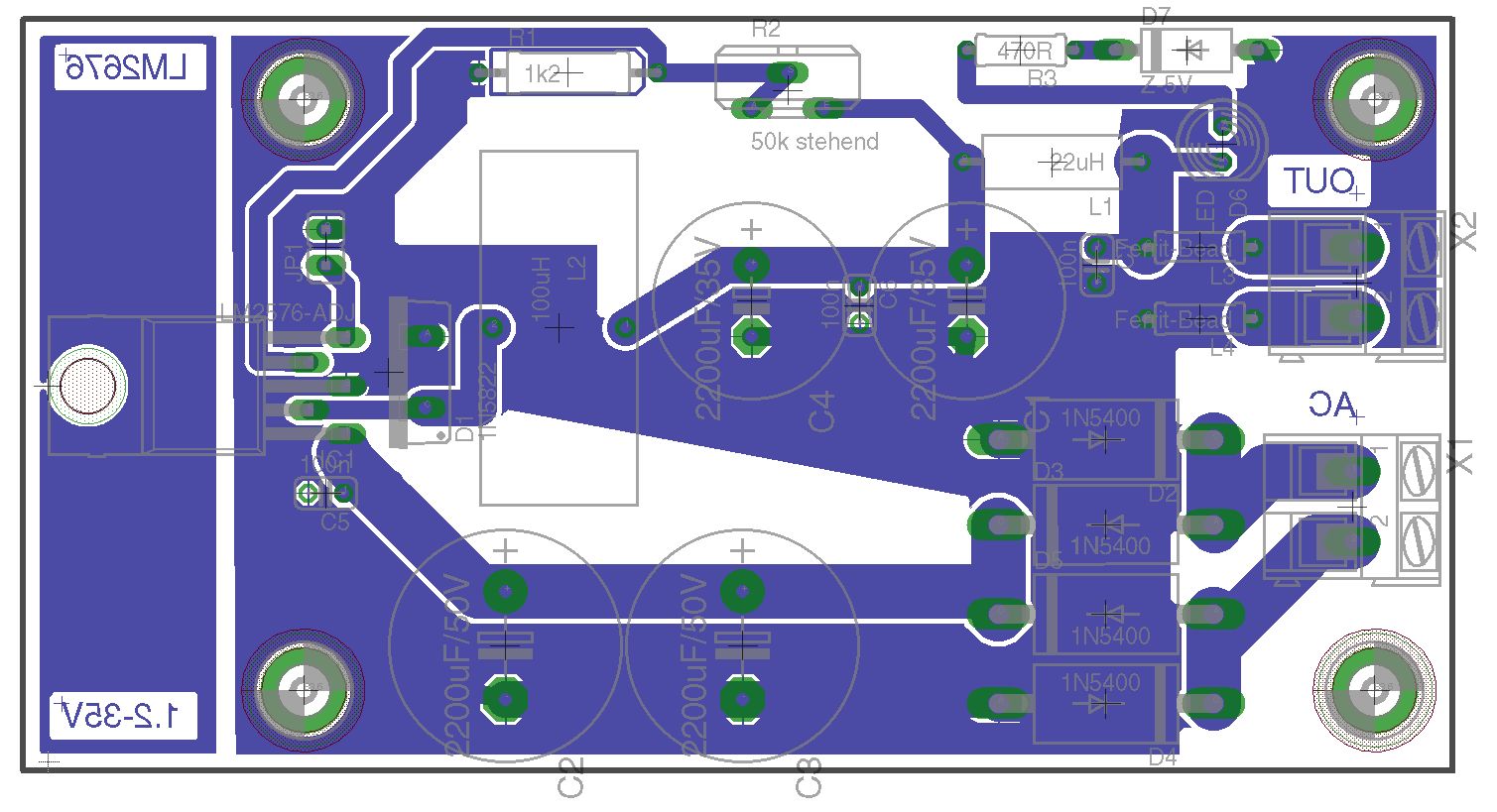 ich hätte hier mal eine LM2576-Adjust-Version. Als Schottky könnte man Wahlweise eine MBR360 o.Ä. verwenden, statt der 1N5822! Ich bin am überlegen, ob man evtl. nach den 22µH noch einen 100µF setzen sollte?!? Ich möchte das Teil universell einsetzen. Anbei mal der Schaltplan sowie das Layout. Jetzt könnt ihr mich mal auseinander nehmen :-) Gruß Michael