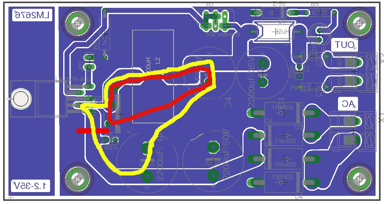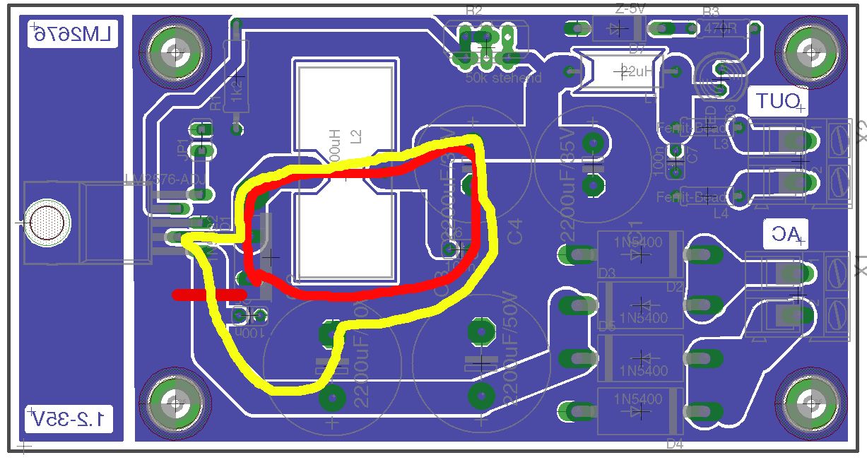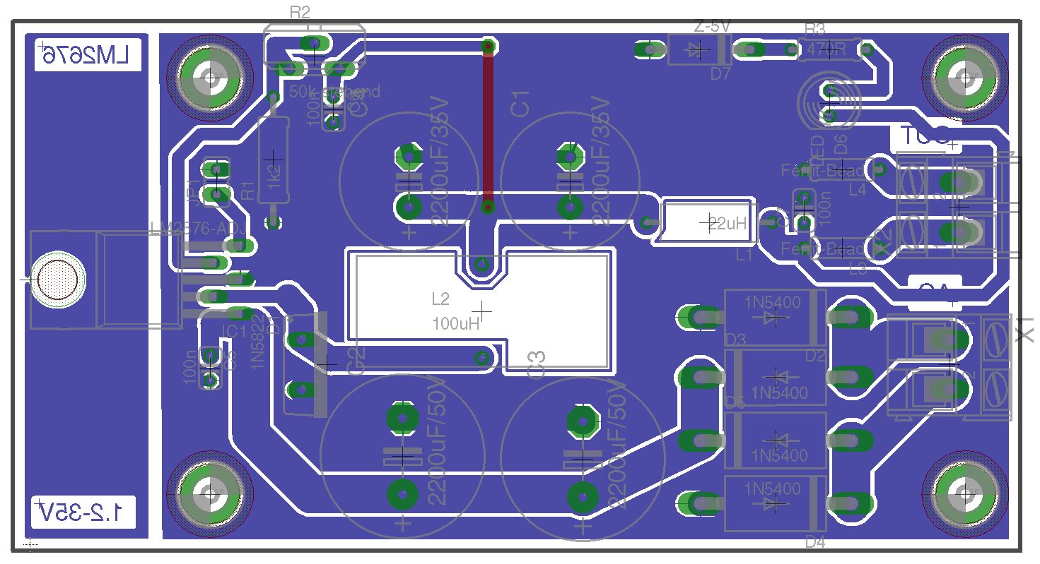 Hat einer mal ausgerechnet, inwieweit die Schaltung auf dem perfekten Layout überhaupt funktionieren kann? Der LM2576 ist weit davon weg, ein Weitbereichs-Typ für Ein- oder Ausgang zu sein. Das Ding wird nix...