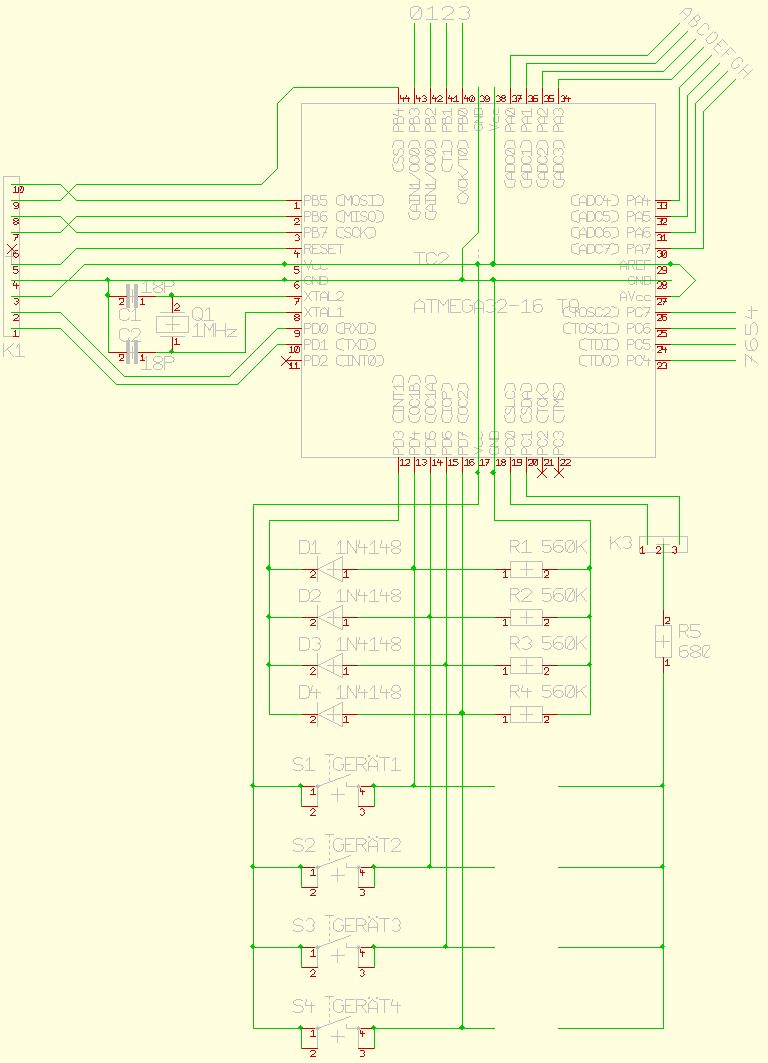 Hallo. Wie kann ich folgende Schaltung auf möglichst geringen Stromverbrauch optimieren ? Einsatzort : Fernbedienung PC1 ist auf einer anderen Platine an der Basis eines Transistors angeschlossen. Am Emitter die IR-LED, der Kollektor über einen 33 Ohm-Widerstand an der 3V-Batteriestromversorgung angeschlossen. Zwischen den Lücken auf der unteren Seite sind rechts neben den Schaltern low-current Leuchtdioden eingesetzt (fehlen wegen der Target 100-Pin-Grenze :-) ). Die Kathoden weisen zum 680 Ohm Widerstand. K1 dient zum Programmieren PA geht an die Zeilenmatrix der Tastatur PB0-3 PC5-7 geht an die Spaltenmatrix der Tastatur Geplant ist beim Auslesen der Matrix, dass eine Zeile auf Low gesetzt wird, und die Spalten ausgelesen werden. Dabei ist zu erwähnen, dass die Pins PB0-3 und PC5-7 Inputs mit aktiviertem Pull-up sind. Dabei soll die ganze Ausleseprozedur äußerst kurz geschehen, um nicht allzuviel Strom über die Pull-ups zu verschwenden. Im Rest der Zeit werden Beide Ports auf low-Ausgang gesetzt. Die Meiste Zeit befindet sich der Mikrocontroller im Power-down Modus. Sobals ein Taster gedrückt wird, soll ein über die Dioden D1-4 zugeführter High-Pegel am Interrupteingang den Controller aufwecken. (geht doch so, oder ?) Die Dioden sollen gleichzeitig eine Auswirkung auf die anderen "Tastersignale" verhindern. Systeme wie ADC, Watchdog und andere nicht benötigte Spielereien sind doch normalerweise ausgeschaltet ? (oder muss man die erst abschalten) Was kann ich tun, um noch mehr Strom zu sparen ?