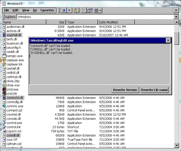 executabilitycheck sagt: siehe Bild. aygshell.dll musste ich nachträglich in den Windows Ordner kopieren. TascalRegEdit.exe befindet sich auch im Windows Ordner. Geht nicht.