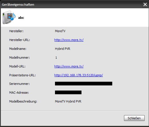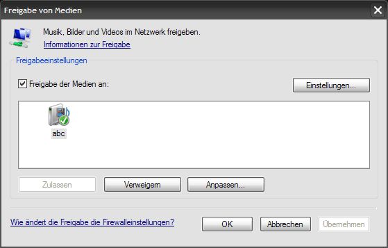 Peer R. schrieb: > Hat das schon jemand verucht? Hier ein Zwischenergebnis: Auf der Box im Menue: Einstellungen > Netzwerk > Gerätename, der Box einen Namen gegeben (abc). Im Windows Media Player auf dem PC (WindowsXP SP3) unter: Extras > Optionen > Medienbibliothek, die Freigabe von Medien aktivieren. Nach kurzer Zeit wird die Box auf dem PC erkannt. Der Media Server wird auf der Box unter: Einstellungen > Netzwerk > Media Server, aber leider nicht erkannt. Im Windows Media Player in der Medienfreigabe, kann man nach Klick mit der rechten Maustaste auf das Box-Icon und Auswahl des Punktes Eigenschaften, noch einige Infos zur Verbindung bekommen.