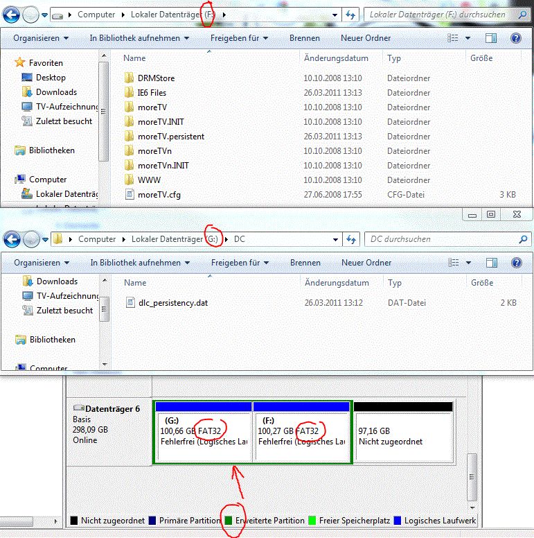Gert Kawa schrieb: > Raoul D. schrieb: > >> Mit welchem Programm hast du die HDD formatiert? Welche Einstellungen? >> Irgendetwas zu beachten? > > Du must erst eine erweiterte Partition erstellen. > In dieser legst Du die beiden FAT32-Partitionen an. > > kawa So sollte es dann stimmen, oder? Funktioniert leider nicht.