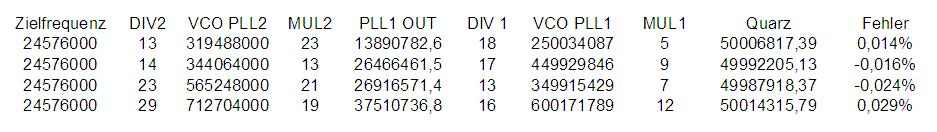 Ich lasse also nur Ergebnisse anzeigen, die im Bereich von max_abweichung um meine Zeilfrequenz liegen. Die "Spiellerei" mit der Aufteilung auf 2 PLLs sollte man ebenfalls mit grundlegenden mathematischen Operationen hinbekommen. Außer für Primzahlen :)