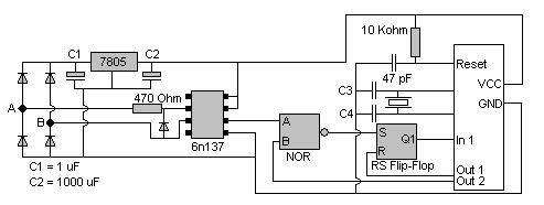 Du beschreibst da nur wieder eine normale Wechselspannung, entweder ist A +15V gegenüber B oder -15V gegenüber B (bitte nicht mitten im Satz den Bezugspunkt wechseln, mal A mal B). Mit einem Brückengleichrichter wirst Du keine Masse hinbekommen, die vor und hinter dem Gleichrichter gleichermassen eine solche darstellt. In dem Fall ist der 6N137 die einfachste Lösung. Erst mit 3 Leitungen wird was anderes draus, also wechselweise +15V an A und +15V an B, bezogen auf einen dritten Massepin. Dann sind's simple 2 Dioden in der Stromversorgung und ein simpler Pegelwandler für den Input.