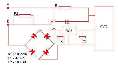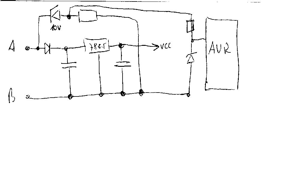 Danke erstmal für eure Antworten! Bei dem Link muss man nochmal mit Rechtsklich auf Bild anzeigen klicken, dann funktionierts. Die Stromquelle kann ohne Probleme 5mA abgeben. Die potentiale müssen eigentlich nicht getrennt werden, da der AVR von der selben Quelle den Strom bezieht, nur gleichgerichtet! Hab ich es richtig verstanden, dass dich einen 10Kohm Wiederstand zwischen A und AVR + Z-Diode zwischen A und B benutzen soll?? Wie muss ich den 1Kohm Wiederstand einbauen? Würde mich sehr über Hilfe freuen! Gruß Tobias