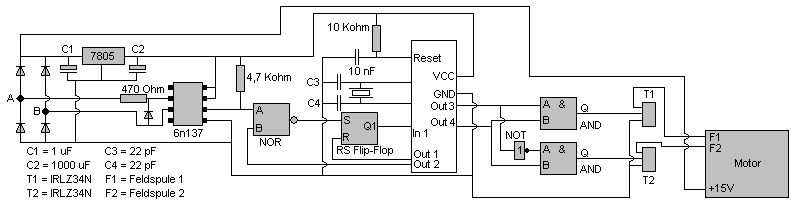 So, habs jetzt verändert! Jetzt muss ich nurnoch schauen, welche IC´s ich am besten für die NOR´s und AND´s nehme. Wie hoch sollte eigentlich die PWM Frequenz bei einem Motor sein?? Reichen da ca 10-20khz?? Gruß Tobias