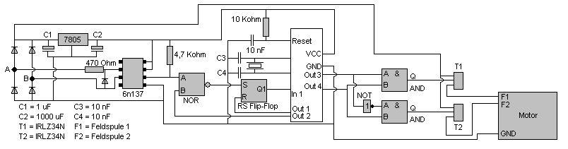 Abgesehen davon hab ich jetzt mal einen kompletten Schaltplan gezeichnet, in dem auch die Ansteuerung des Motors abgebildet ist. Der AVR erzeugt an Out 3 eine PWM Frequenz und über die AND und NOT Gatter wird der End-Mosfet angesteuert, der die PWM Frequenz auf die gewählte Feldspule leitet. Den IRLZ34N hab ich gewählt, da er anscheinend TTL kompatiebel ist. Den Strom von 30A werde ich mit dem Motor garantiert nie ausnutzen aber egal g Könnte meine Schaltung so funktionieren??? Würde mich sehr über Hilfe freuen! Gruß Tobias