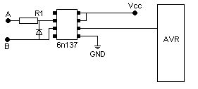 In der Tat, er invertiert, aber ist das nicht eine Frage der Software? Aber egal, ggf. einfach A und B vertauschen. Der 6N137 hat keinen Pullup am Ausgang und der im AVR könnte zu gross sein, d.h. zu langsam.