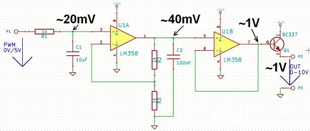 Hallo, habe mal eine Frage zu meiner Schaltung. Wenn ich den Ausgang vom Mikrocontroller auf 0V lege, erhalte ich ca. 20mV am nicht invertierenden Eingang des ersten OP´s (Pin3). OK, damit kann ich leben. Am Ausgang dieses OP´s erhalte ich dann ca. 40mV, was aufgrund der Verstärkung auch so weit O.k. ist. Mein Problem ist aber, dass am Ausgang des Impedanzwandlers gegenüber GND und am Lastwiderstand (OUT) eine Spannung von ca. 1V anliegt. Diese 1V erhalte ich, wenn eine Last von ca. 100kOhm angeschlossen ist. Bei einem geringeren Lastwiderstand erhalte ich eine etwas geringere Ausgangsspannung 1kOhm=ca.800mV. Meine Frage ist nun, wo diese Spannung herkommt? Können die Leckströme des Transistors so hohe Spannungen verursachen? Der Transistor ist übrigens notwendig, da ich den Ausgang bis 500mA belasten möchte. Allerdings sollte auch bei geringer Last die Ausgangsspannung bis ca. 0V einstellbar sein. Schon mal vielen Dank Grüße Stefan