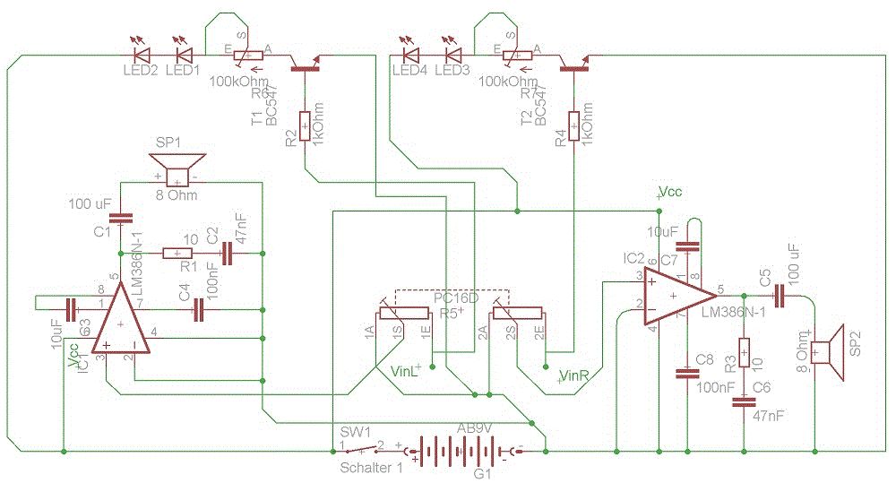 Hallo, vielleicht hatte jemand ja mein altes Thema "Problem mit LM386-Verstärkerschaltung" gelesen. Dort ging es darum, dass die Schaltung (als Audioverstärker) auf dem Steckbrett aufgebaut zunächst nicht funktioniert hat. Jetzt habe ich versucht, das zu bauen, was ich eigentlich vorhatte, und stehe wieder vor einem Problem: Mein Ziel war es, eine mit 9V betriebene Verstärkerschaltung zu bauen, die ich an einen MP3-Player hängen kann, um 8Ohm-Lautsprecher zu betreiben. Zusätzlich sollten noch LEDs im Rhythmus blinken, zwei für den linken Audiokanal und zwei für den rechten. Gelötet habe ich alles auf eine Punktrasterplatine, den Schaltplan habe ich oben angehängt (hoffe, er ist übersichtlich genug). Die Schaltung für den LM386N-1 habe ich direkt aus dem Datenblatt entnommen und an sich funktioniert das so auch einwandfrei. Nur leider habe ich ein großes Problem: Ich habe die Schaltung nun schon zum zweiten Mal neu aufgebaut, aber jedes Mal funktioniert nur eine Seite richtig. Während - im jetzigen Aufbau - die rechte Seite wunderbar funktioniert, kommt auf der linken Seite nur ein lauter "Tröt"-Ton, wenn ich über das Potentiometer die Lautstärke auf ein Minimum stelle. Drehe ich das Poti in die andere Richtung (für maximale Lautstärke), kann man die Musik schon raushören, allerdings natürlich sehr verzerrt, da die Lautsprecher einfach nicht auf diese Lautstärke ausgelegt sind. Die LEDs funktionieren übrigens für beide Seiten wunderbar. Ich habe (natürlich beide Male, als ich die Schaltung aufgebaut habe) schon alles versucht, was mir eingefallen ist dazu: Natürlich habe ich als erstes das Kabel von der Audioquelle umgedreht, sprich linken und rechten Kanal vertauscht -> keine Besserung, der Fehler muss also in der Schaltung liegen. Dann habe ich die ICs getauscht, um zu schauen, ob einer defekt ist -> auch kein Erfolg. Zu guter Letzt habe ich natürlich noch die Lautsprecher vertauscht, aber wieder: kein Erfolg. Die linke Seite hört sich genauso an wie damals, als ich die Schaltung auf dem Steckbrett aufgebaut habe. Dort wurde als Grund genannt, dass die Schaltung schwingt. Deshalb habe ich auch den ersten Aufbau auf der Lochrasterplatine noch einmal abgebaut, da ich vermutet habe, dass ich vielleicht die Kabel zu unsauber verlegt habe. Beim zweiten Versuch habe ich also darauf geachtet, dass sich so wenig Kabel wie möglich kreuzen und diese möglichst gerade verlaufen und nicht länger als nötig sind. Aber auch das scheint für die Katz gewesen zu sein. Ein Bild habe ich angehängt (ist beide Male das Gleiche, habe nicht gesehen, wo man ein bereits hochgeladene Bilder wieder löschen kann). Da ich noch blutiger Anfänger bin, bin ich jetzt bereits mit meinem Latein am Ende. Die Kontakte habe ich alle mit dem Multimeter durchgemessen, an denen sollte es auch nicht liegen. Ich wäre also sehr froh, wenn mir hier einen von den alten Hasen weiterhelfen könnte. Bei jedem, der sich Zeit nimmt, um sich mit meinem Problem zu befassen, bedanke ich mich schon einmal im Voraus. Mit freundlichen Grüßen, Andi