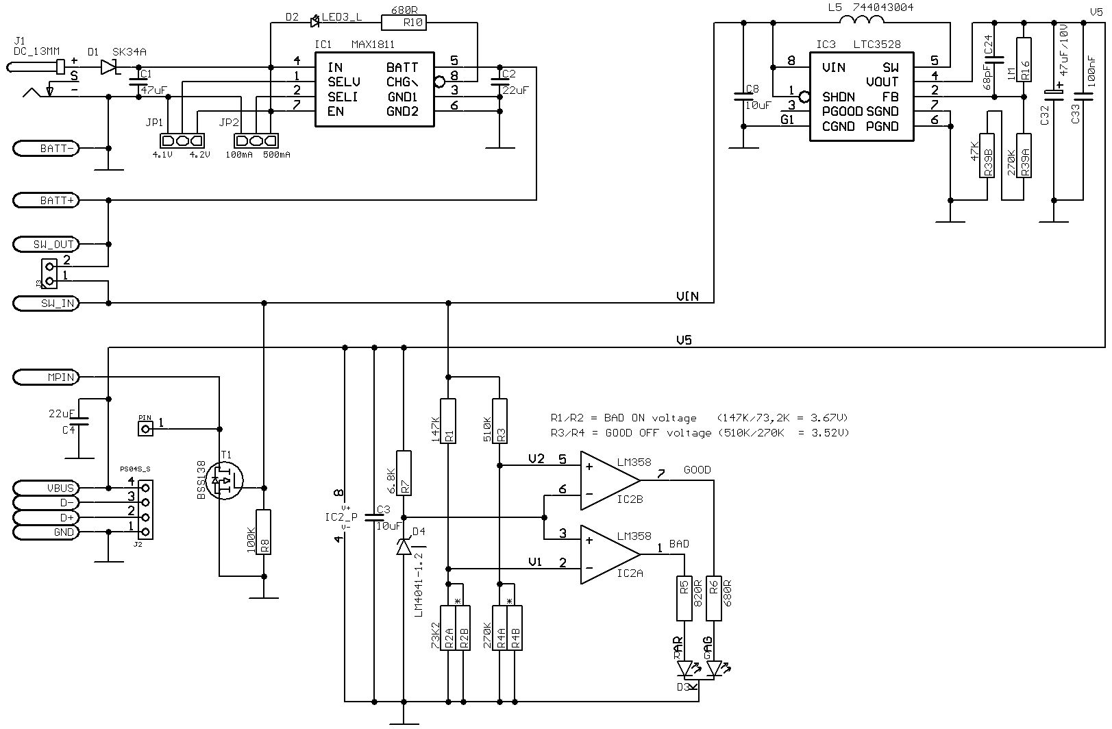 Hallo zusammen, ich suche eine Alternative zum IC3 (Typ LTC3528) oben rechts. Es handelt sich dabei um einen Step-Up-Converter der mir die Batteriespannung von 3,7V auf 5V boosten soll. Habt ihr einen Vorschlag für mich? Im Anhang befindet sich der aktuelle Schaltplan. ----------- Kurze Erklärung zum Schaltplan, falls notwendig: Oben links befindet sich die Ladeeinheit für den Akku. Es handelt sich dabei um einen Li-Ion Akku 3,7 Volt - 2600mAh. Links Mitte ist der Ein/Aus-Schalter. Unten links ist der Anschluß für USB mit einem FET der einen Massepin auf Ground zieht. Der Massepin beeinflusst die Betriebsart der zweiten angeschlossenen Platine. Unten rechts ist eine OP-Vergleichsschaltung, die mir über eine Duo-LED die restliche Akkuspannung optisch anzeigt. Dient dazu, dass der Akku nicht Tiefentladen wird (bei roter LED ausschalten und Akku laden!) und man in etwa die restliche Laufzeit bestimmen kann. ----------- Danke für eure Hilfe!