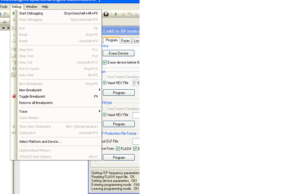 spess53 schrieb: > Hi > > Start Debugging > > JTAGICEmkII Options->Debugwire deaktivieren. danke spress aber es hat nicht funktioniert, ich habe gesehen, bei SPIEN Fuse einen fragenzeichen könnte es das problem sein??