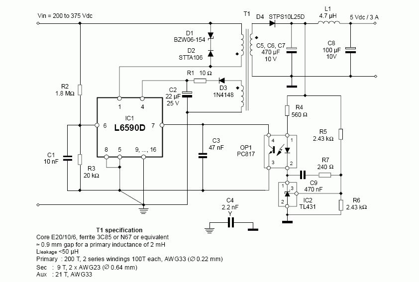 Also wie ich das sehe brauchst Du ajF ein Schaltnetzteil, sonst wirst Du mit Deinen Größenvorgaben nicht hinkommen. Die meisten mir bekannten Schaltungen liefern allerdings nur etwa 3-4A (siehe Anhang). Allerdings für kaum >5EUR. Vielleicht könntest Du aber 2 davon zusammenschalten!? Oder such' mal nach VIPer20 (Viper100 für 3A gibts bei Reichelt für 3,70EUR). Oder mal nach SMPS suchen, da gibts es Schaltpläne von z.B. PC-Netzteilen, die dann auch >10A packen. Allerdings sind die alle etwas heftiger vom Aufbau und Dir wahrscheinlich nicht klein genug ... Grusz TW