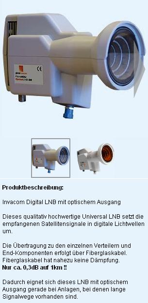 Hallo, da gibt es bei reichelt einen LNB http://www.reichelt.de/?ACTION=3;ARTICLE=87849;PROVID=2402 Mich würde mal interressieren, welche Bauteile darin für Sender und Empfänger verbaut sind, wo bekomme ich eine Photodiode, die mehrere GHz kann? Natürlich könnte ich einfach einmal so einen LNB und den Emfänger dazu kaufen, und das ganze dann zerlegen. Aber wenn die Schlüsselkomponeten vergossen sind, habe ich auch nichts erreicht.