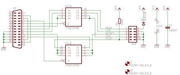 Hallo! Ich habe folgendes Problem: ich möchte mir einen ISP von LTP auf 5 Polig ISP bauen. Als Grundlage möchte ich den angehängten Schaltplan benutzen (die Bauteile habe ich mir alle schon besorgt). Ich möchte aber keinen 10 Poligen ISP, da ich den Mega direkt auf dem Steckbrett programmieren will (den ISP einfach neben den Mega stecken). Mein Hauptproblem ist die unterschiedliche Belegung. Beim 5er: MISO,MOSI,SCK,GND Beim 10er. MOST,LED,RESET,SCK,MISO VCC,GND,GND,GND,GND Ich hoffe mir kann jemand helfen. MfG ACU