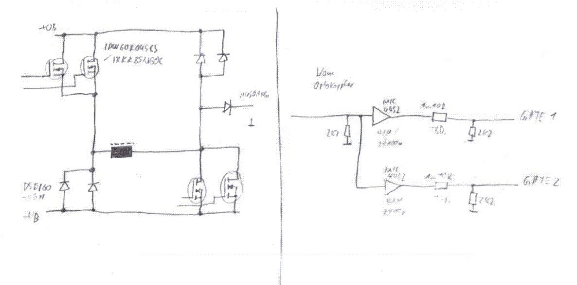 Anbei mal die Schaltung. Es handelt sich um eine Pulsstromquelle. Es wird mit den Transistoren oben links ein Strom im Drosselkreis aufrechterhalten, die obere Stufe muss also im Prinzip die Verluste nachladen. Die Stufe unten Rechts ist geschlossen. Wenn diese öffnet wird ein Stromimpuls über die Diode ausgekoppelt. Das Schaltungsprinzip war deshalb notwendig, weil die Verlustleistungen einer linearen Endstufe viel zu hoch gewesen wären. Die Ladefrequenz variiert je nach Betriebsfall, ist aber maximal 50-60kHz. Ich hab mal die Laufzeitdifferenzen der Treiberbausteine gemessen, die liegen unterhalb 1 ns! ich denke nicht, dass das die Ursache sein kann. Die Transistoren mit denen das alles Funktioniert (nur mit Ferritperlen) sind IPW60R045CS nicht CP, die hab ich garnicht hergekriegt. Aufgrund des hohen Dauerstroms hatte ich jetzt auch nicht so ne große Auswahl an MOSfets, da alles über 50mOhm eigentlich zu viel Verluste produziert. Schnell schalten will man ja eigentlich auch um die Schaltverluste klein zu halten, daher die Wahl. Die Infineons hab ich eigentlich nur eingesetzt, weil ich die IXYS auch nicht hergekriegt hatte. (zur Info, in den IXYS sind auch Infineonchips drin bei den COOLMOS)
