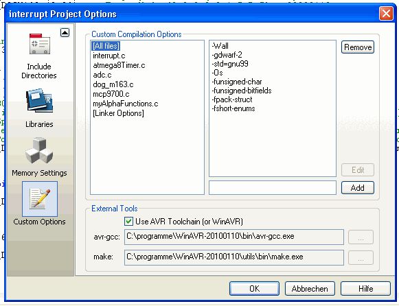 OK, ich habe das jetzt als ein feld eingetragen. hier die compiler meldung mit dem Eintrag: Build started 20.3.2011 at 09:29:50 avr-gcc -I"E:\TinoKuehn\AVR\myAlphaSteuerungv3\." -mmcu=atmega8 -Wall -gdwarf-2 -std=gnu99 -Os -funsigned-char -funsigned-bitfields -fpack-struct -fshort-enums -MD -MP -MT dog_m163.o -MF dep/dog_m163.o.d -c ../dog_m163.c avr-gcc -mmcu=atmega8 -Wl,--gc-sections -Wl,-Map=interrupt.map interrupt.o atmega8Timer.o dog_m163.o myAlphaFunctions.o -lc -o interrupt.elf avr-objcopy -O ihex -R .eeprom -R .fuse -R .lock -R .signature interrupt.elf interrupt.hex avr-objcopy -j .eeprom --set-section-flags=.eeprom="alloc,load" --change-section-lma .eeprom=0 --no-change-warnings -O ihex interrupt.elf interrupt.eep || exit 0 avr-objdump -h -S interrupt.elf > interrupt.lss hier ohne: rm -rf interrupt.o atmega8Timer.o dog_m163.o myAlphaFunctions.o interrupt.elf dep/* interrupt.hex interrupt.eep interrupt.lss interrupt.map Build succeeded with 0 Warnings... avr-gcc -I"E:\TinoKuehn\AVR\myAlphaSteuerungv3\." -mmcu=atmega8 -Wall -gdwarf-2 -std=gnu99 -Os -funsigned-char -funsigned-bitfields -fpack-struct -fshort-enums -MD -MP -MT interrupt.o -MF dep/interrupt.o.d -c ../interrupt.c avr-gcc -I"E:\TinoKuehn\AVR\myAlphaSteuerungv3\." -mmcu=atmega8 -Wall -gdwarf-2 -std=gnu99 -Os -funsigned-char -funsigned-bitfields -fpack-struct -fshort-enums -MD -MP -MT atmega8Timer.o -MF dep/atmega8Timer.o.d -c ../atmega8Timer.c avr-gcc -I"E:\TinoKuehn\AVR\myAlphaSteuerungv3\." -mmcu=atmega8 -Wall -gdwarf-2 -std=gnu99 -Os -funsigned-char -funsigned-bitfields -fpack-struct -fshort-enums -MD -MP -MT dog_m163.o -MF dep/dog_m163.o.d -c ../dog_m163.c avr-gcc -I"E:\TinoKuehn\AVR\myAlphaSteuerungv3\." -mmcu=atmega8 -Wall -gdwarf-2 -std=gnu99 -Os -funsigned-char -funsigned-bitfields -fpack-struct -fshort-enums -MD -MP -MT myAlphaFunctions.o -MF dep/myAlphaFunctions.o.d -c ../myAlphaFunctions.c avr-gcc -mmcu=atmega8 -Wl,-Map=interrupt.map interrupt.o atmega8Timer.o dog_m163.o myAlphaFunctions.o -lc -o interrupt.elf avr-objcopy -O ihex -R .eeprom -R .fuse -R .lock -R .signature interrupt.elf interrupt.hex avr-objcopy -j .eeprom --set-section-flags=.eeprom="alloc,load" --change-section-lma .eeprom=0 --no-change-warnings -O ihex interrupt.elf interrupt.eep || exit 0 avr-objdump -h -S interrupt.elf > interrupt.lss das ohne ist deutlich mehr. aber die % des programmspeicherverbrauchs sind komplett gleich...
