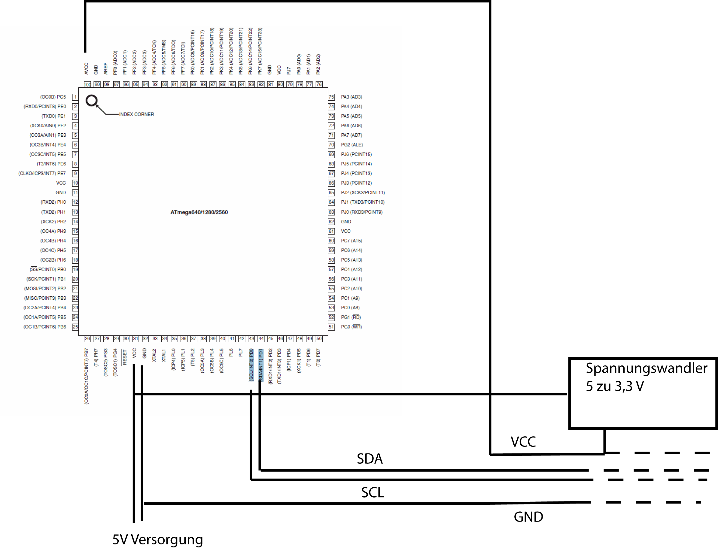 Ich glaube ich habe meine Denkblockade erkannt. Ich bin davon ausgegeangen, dass der AVR sozusagen, da er sich ja selbst versorgt kein VCC Anschluss besitzt Sprich Bild 1. Was falsch ist. Eigentlich ist es ja auch logisch da er ja auch Slave sein kann, dass er so aussehen muss wie jeder andere Teilnehmer auch. Wie im Wiki http://upload.wikimedia.org/wikipedia/commons/3/3e/I2C.svg. D.h. er bekommt ebenfalls irgendwoher eine Versorgungsspannung in dem Fall eine zweite diesmal mit 3,3V vom Bus. Jetzt frage ich mich aber dafür wo dann VCC und GND beim Atmega reinkommen. Ich nehme an GND wird egal sein und ich kann dafür jeden pin nehmen. Aber wo schließe ich VCC an. Schließlich läuft der Atmega selber ja sonst mit 5V. Ich würde jetzt mal tippen, dass man sozusagen VCC der Leitung in AVCC also Pin 100 anschließt? (Bild 2) Falls es so ist. Vielen Dank für die Antworten ich glaube ich glaube ich hatte ne riesen Denkblockade indem ich den Atmega als Ursprung gesehen habe. Das lag auch daran das es die zweite Front hier gab die wahrsch. dachte ich meine wie man das regelt wenn man einmal eine 5V Versorgungsleitung hat und einmal eine 3,3V.