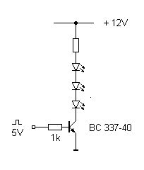 Ah ok das hab ich jetzt soweit verstanden (mit welchem Programm kann man so eine schöne Schaltung zeichnen?) Zum Basiswiderstand (hierfür habe ich eine Beispielrechnung im Internet gefunden): Kollektorstrom max.: 100mA (40mA für LEDs und Reserve) Verstärkungsfaktor (BC337-40): 250-630 (dann soll man angeblich mit 250 rechnen) Übersteuerungsfaktor: 3 (zur sicheren Sättigung) Schaltschwelle ist angeblich 0,7 V --> Basisstrom=100mA/160*3=1,875mA Jetzt noch 5V-0,7V=4,3V Basiswiderstand=4,3V/0,001875A=2293 Ohm --> Ich benutze einen 2,2 kOhm Basiswiderstand http://www.conrad.de/ce/de/product/400297/WIDERSTAND-KOHLE-01-W-5-2K2-BF-0204/0241110&ref=list Ich hoffe meine Rechnung hat gepasst