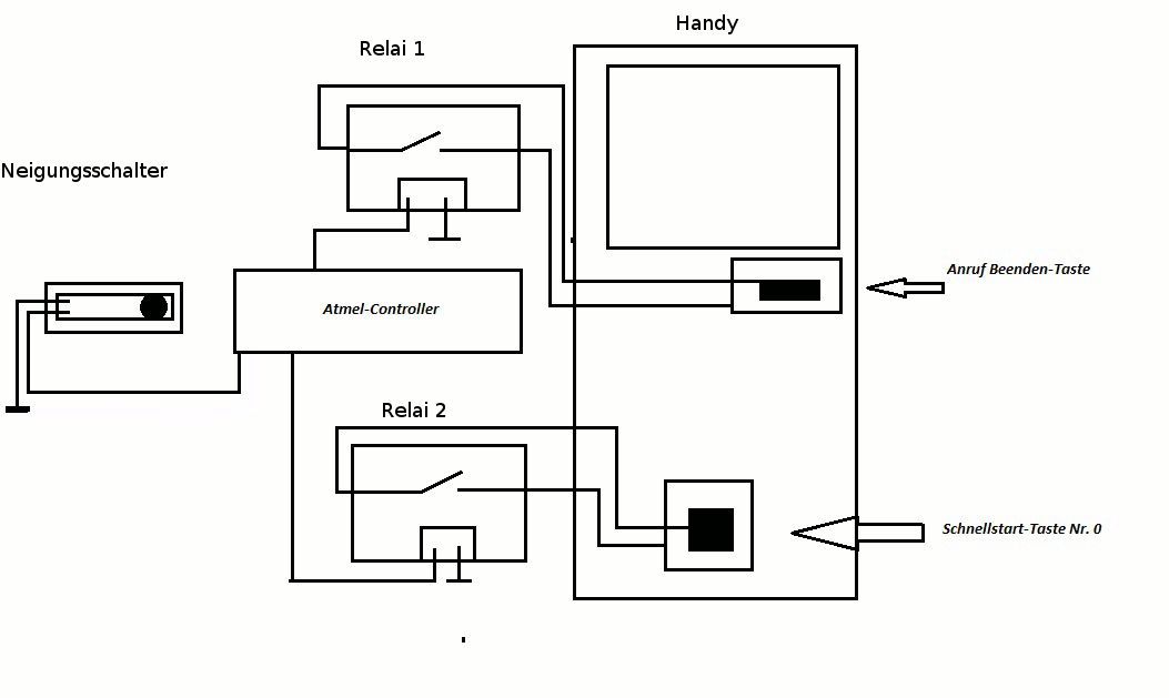 Ja hab auch schon was gefunden, leider.... ist mir das irgendwie zu Klobig, man könnte es auch sehr simpel per Neigungsschalter machen, indem man den einfach an die schnellstart-taste Nr.1 lötet, bei einer gewissen neigung wird die brücke geschlossen, es wird dann die taste 1 gedrückt gehalten, u. die vorher eingespeicherte nummer wird angerufen ich hab mir mal vor langer zeit das AVR Microcontroller Lehrbuch gekauft, u. versuch jetzt anhand der simplen LED beispiele u. meinem testboard sowas zu bauen. Vielleicht denkt ihr zu kompliziert oder ich zu einfach :), ich versuch das anhand einer zeichnung zu erklären: zur Info: Meine Handynummer ist auf schnellstarttaste Nr. 0 gespeichert 1. Das "System" wird durch ein tier bewegt, der neigungssensor schließt den stromkreis 2. der Microcontroller soll nun das Relai Nr. 2, für ca. 3 Sekunden Aktivieren, so das der stromkreis von der Schnellstarttaste 0 geschlossen wird = Alarmhandy ruft die auf der schnellstart-taste gespeicherte nummer an 3. Nach ca. 30 Sekunden soll sich das Relai Nr. 1 Aktivieren so das der Anruf beendet wird 4. Es soll wieder alles "Scharf" sein, eben Relais in Ausgangstellung Schaltplan: http://img156.imageshack.us/f/testso.gif/ Ich hoffe das der Schaltplan so funktionieren würde, ich bin für jede verbesserung offen, der Neigunggschalter ist vielleicht etwas weniger geeignet... aber würde funktionieren