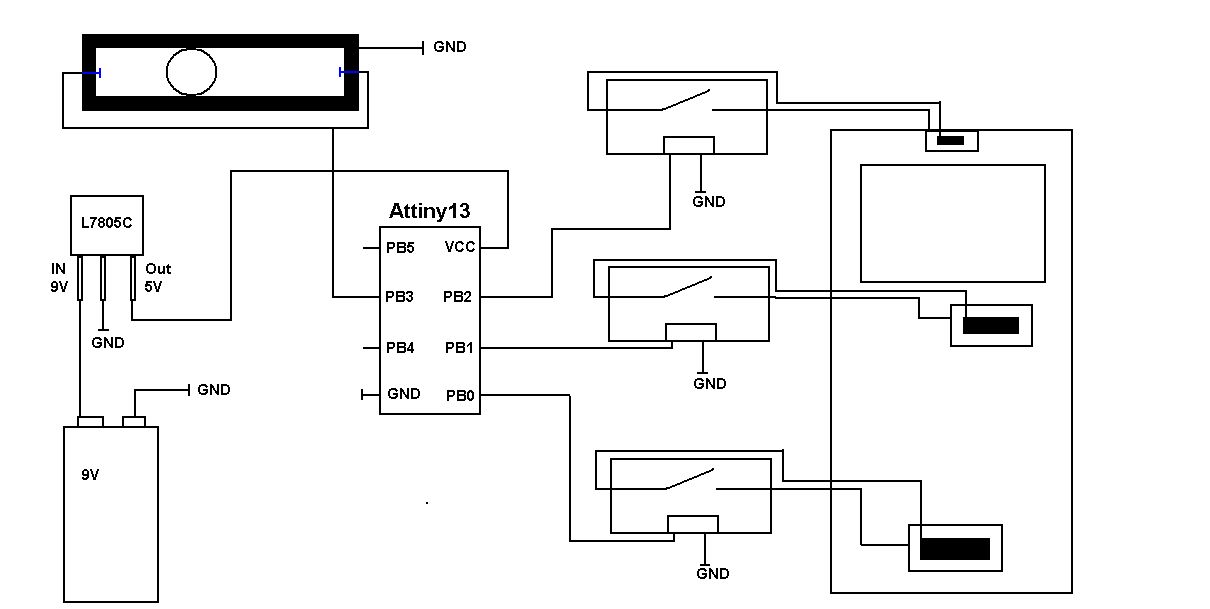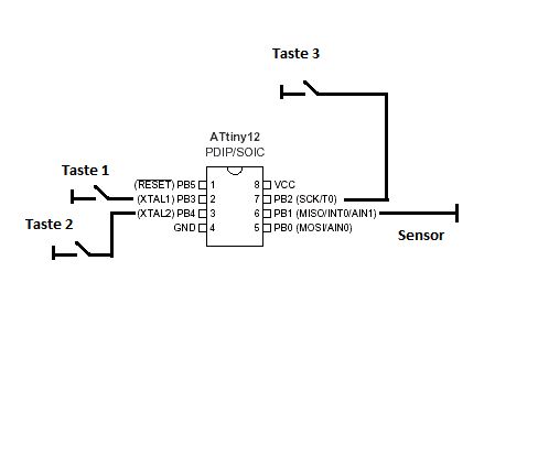Ich hab hier jetzt den Plan gezeichnet wie alles angeschlossen ist, kann mir bitte jemand den Code schreiben bzw. von oben umschreiben damits funktioniert, -.- bei mir verabschiedet sich ein Attiny nach dem anderen... einer hat zum schmoren angefangen, keine ahnung warum