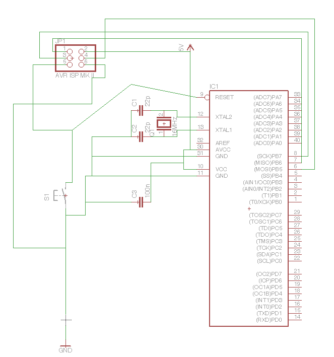 Kleine Anregung im Anhang. Soweit ist da bei dir kein wirklicher Fehler zu erkennen... Auf Kondensator C2 verzichte Ich desöfteren. Die Abblockkondensatoren zu 100nF sollten aber in jedem Falle drin sein. PS: Hast du evtl. (ist mir anfangs mal passiert) die Pfosten/Buchse für den ISP versehentlich spiegelverkehrt gelötet?