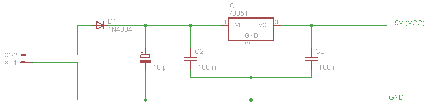 Ja, das stimmt schon. Die rote Markierung am Kabel ist ja immer die (1). Dass der µC wie du sagst so heiß wurde ist bedenklich... Evtl. ist er wirklich schlichtweg hinüber. Nach weiterem intensiven prüfen der Schaltung ansich könntest du einen neuen Versuch mit einem anderen ATMega machen, sofern du noch einen da hast. Der MKII selbst ist aber definitiv in Ordnung? Für eine saubere Stromversorgung habe Ich dir als Anregung mal eine Spannungswandler-Schaltung mit dem 7805 angehängt. Abblockkondensatoren: Da kurzzeitig recht hohe Ströme durch die ICs aufgenommen werden, könnte kurzzeitig ein Spannungseinbruch auftreten. Dem wirkt man mit den Abblockkondensatoren entgegen.