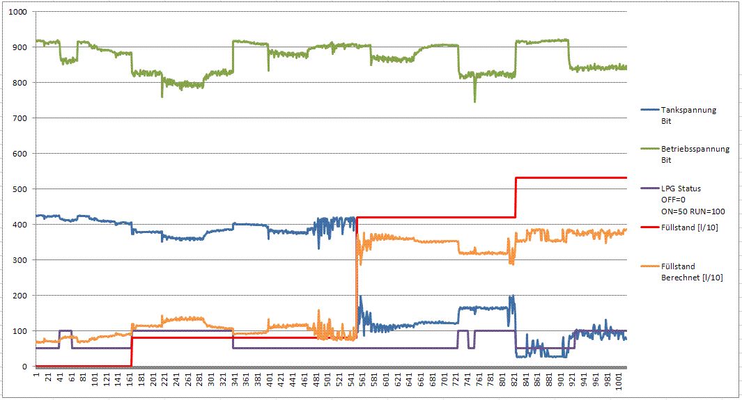 Seit Wochen versuche ich folgendes Problem zu knacken und komme nicht so recht weiter. Vielleicht hat einer von euch eine Idee. Es soll der Füllstand eines LPG Tanks im KFZ hinreichend genau gemessen werden. Bisherige Methoden durch Mittelwertbildung über ca. 4 min erreichten Genauigkeiten von ca. 5l angestrebt werden kleiner 1l. Unbefriedigend ist derzeit, dass sich die Anzeige mit dem Betriebszustand (ON/RUN) verändert was sich auch durch eine Veränderung der Betriebsspannung zeigt. Gegeben ist im Exel File im Anhang: - Die Betriebsspannung (grün) - Die Tankspannung (blau) die eigentlich den Füllstand angeben soll aber irgendwie durch die Betriebsspannung und den Betriebszustand verfälscht wird. - LPG Status (lila) = Betriebszustand, zur Darstellung in Zahlen gewandelt ON=50, RUN=100 Gewünscht ist nun aus den drei oberen Daten die rote Kurve (Füllstand) möglichst exakt zu berechnen. Der Übergang von einem Füllstand zum anderen muss natürlich nicht exakt rechteckig abgebildet werden. Die Orangene kurve ist mein kläglicher Versuch diese Berechnung zu machen. Findet einer die korrekte Formel zur Berechnung des Füllstandes?